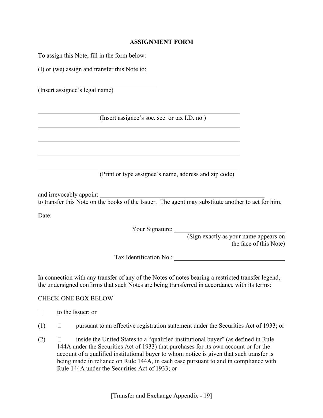[Transfer and Exchange Appendix - 19] ASSIGNMENT FORM To assign this Note, fill in the form below: (I) or (we) assign and transfer this Note to: _____________________________________ (Insert assignee’s legal name) (Insert assignee’s soc. sec. or tax I.D. no.) (Print or type assignee’s name, address and zip code) and irrevocably appoint ____________________________________________________ to transfer this Note on the books of the Issuer. The agent may substitute another to act for him. Date: Your Signature: ___________________________________ (Sign exactly as your name appears on the face of this Note) Tax Identification No.: ___________________________________ In connection with any transfer of any of the Notes of notes bearing a restricted transfer legend, the undersigned confirms that such Notes are being transferred in accordance with its terms: CHECK ONE BOX BELOW  to the Issuer; or (1)  pursuant to an effective registration statement under the Securities Act of 1933; or (2)  inside the United States to a “qualified institutional buyer” (as defined in Rule 144A under the Securities Act of 1933) that purchases for its own account or for the account of a qualified institutional buyer to whom notice is given that such transfer is being made in reliance on Rule 144A, in each case pursuant to and in compliance with Rule 144A under the Securities Act of 1933; or