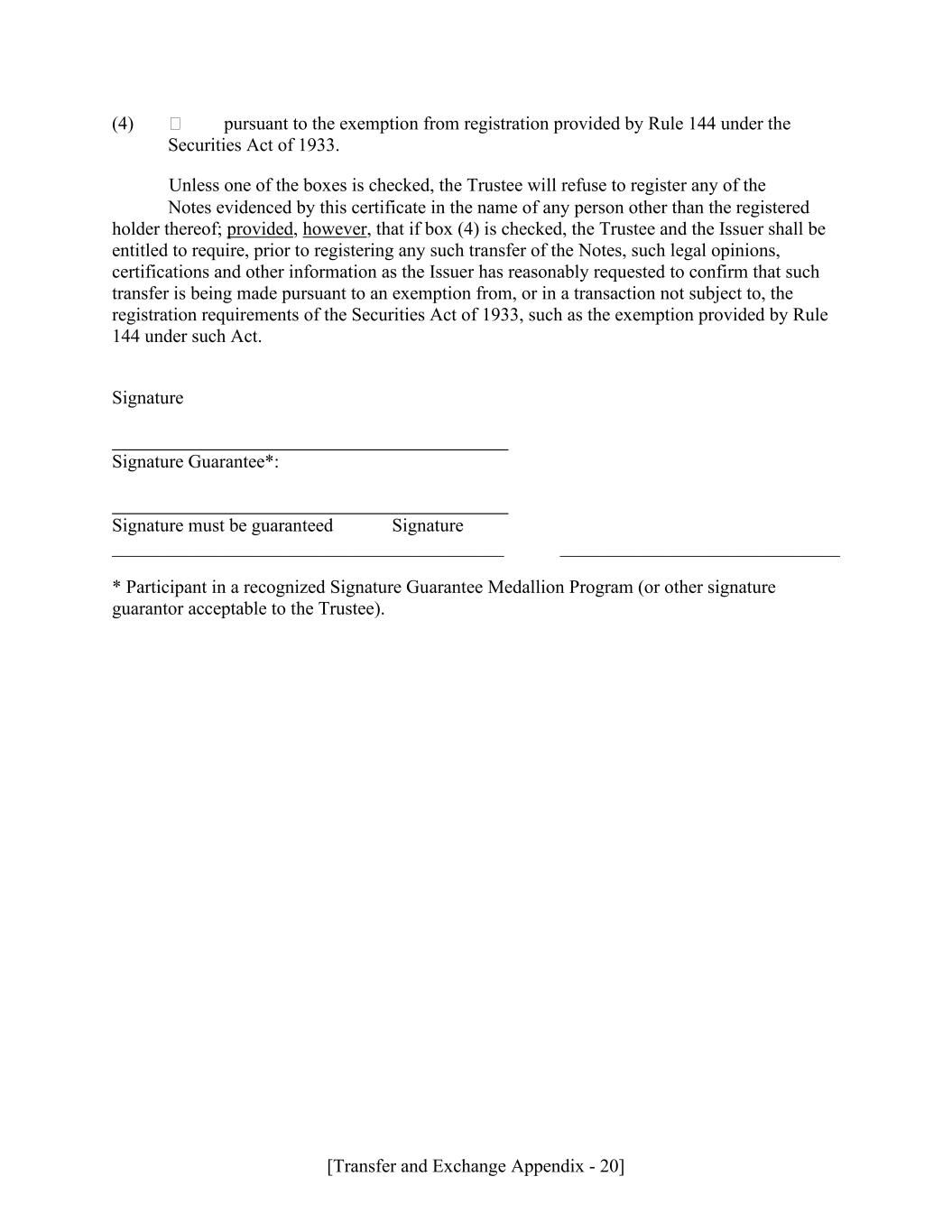 [Transfer and Exchange Appendix - 20] (4)  pursuant to the exemption from registration provided by Rule 144 under the Securities Act of 1933. Unless one of the boxes is checked, the Trustee will refuse to register any of the Notes evidenced by this certificate in the name of any person other than the registered holder thereof; provided, however, that if box (4) is checked, the Trustee and the Issuer shall be entitled to require, prior to registering any such transfer of the Notes, such legal opinions, certifications and other information as the Issuer has reasonably requested to confirm that such transfer is being made pursuant to an exemption from, or in a transaction not subject to, the registration requirements of the Securities Act of 1933, such as the exemption provided by Rule 144 under such Act. Signature Signature Guarantee*: Signature must be guaranteed Signature __________________________________________ ______________________________ * Participant in a recognized Signature Guarantee Medallion Program (or other signature guarantor acceptable to the Trustee).