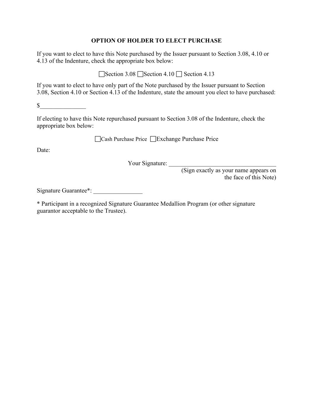 OPTION OF HOLDER TO ELECT PURCHASE If you want to elect to have this Note purchased by the Issuer pursuant to Section 3.08, 4.10 or 4.13 of the Indenture, check the appropriate box below: Section 3.08 Section 4.10 Section 4.13 If you want to elect to have only part of the Note purchased by the Issuer pursuant to Section 3.08, Section 4.10 or Section 4.13 of the Indenture, state the amount you elect to have purchased: $_______________ If electing to have this Note repurchased pursuant to Section 3.08 of the Indenture, check the appropriate box below: Cash Purchase Price Exchange Purchase Price Date: Your Signature: ___________________________________ (Sign exactly as your name appears on the face of this Note) Signature Guarantee*: ________________ * Participant in a recognized Signature Guarantee Medallion Program (or other signature guarantor acceptable to the Trustee).