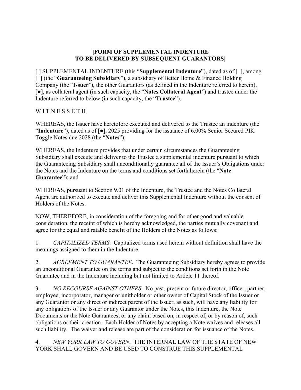 [FORM OF SUPPLEMENTAL INDENTURE TO BE DELIVERED BY SUBSEQUENT GUARANTORS] [ ] SUPPLEMENTAL INDENTURE (this “Supplemental Indenture”), dated as of [ ], among [ ] (the “Guaranteeing Subsidiary”), a subsidiary of Better Home & Finance Holding Company (the “Issuer”), the other Guarantors (as defined in the Indenture referred to herein), [●], as collateral agent (in such capacity, the “Notes Collateral Agent”) and trustee under the Indenture referred to below (in such capacity, the “Trustee”). W I T N E S S E T H WHEREAS, the Issuer have heretofore executed and delivered to the Trustee an indenture (the “Indenture”), dated as of [●], 2025 providing for the issuance of 6.00% Senior Secured PIK Toggle Notes due 2028 (the “Notes”); WHEREAS, the Indenture provides that under certain circumstances the Guaranteeing Subsidiary shall execute and deliver to the Trustee a supplemental indenture pursuant to which the Guaranteeing Subsidiary shall unconditionally guarantee all of the Issuer’s Obligations under the Notes and the Indenture on the terms and conditions set forth herein (the “Note Guarantee”); and WHEREAS, pursuant to Section 9.01 of the Indenture, the Trustee and the Notes Collateral Agent are authorized to execute and deliver this Supplemental Indenture without the consent of Holders of the Notes. NOW, THEREFORE, in consideration of the foregoing and for other good and valuable consideration, the receipt of which is hereby acknowledged, the parties mutually covenant and agree for the equal and ratable benefit of the Holders of the Notes as follows: 1. CAPITALIZED TERMS. Capitalized terms used herein without definition shall have the meanings assigned to them in the Indenture. 2. AGREEMENT TO GUARANTEE. The Guaranteeing Subsidiary hereby agrees to provide an unconditional Guarantee on the terms and subject to the conditions set forth in the Note Guarantee and in the Indenture including but not limited to Article 11 thereof. 3. NO RECOURSE AGAINST OTHERS. No past, present or future director, officer, partner, employee, incorporator, manager or unitholder or other owner of Capital Stock of the Issuer or any Guarantor or any direct or indirect parent of the Issuer, as such, will have any liability for any obligations of the Issuer or any Guarantor under the Notes, this Indenture, the Note Documents or the Note Guarantees, or any claim based on, in respect of, or by reason of, such obligations or their creation. Each Holder of Notes by accepting a Note waives and releases all such liability. The waiver and release are part of the consideration for issuance of the Notes. 4. NEW YORK LAW TO GOVERN. THE INTERNAL LAW OF THE STATE OF NEW YORK SHALL GOVERN AND BE USED TO CONSTRUE THIS SUPPLEMENTAL