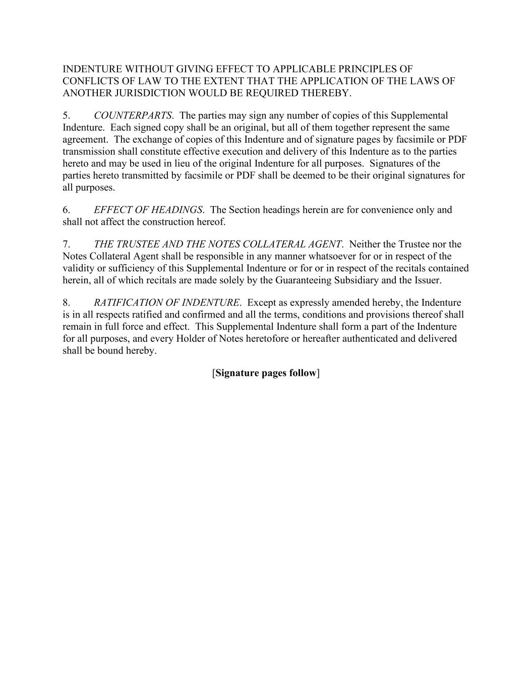 INDENTURE WITHOUT GIVING EFFECT TO APPLICABLE PRINCIPLES OF CONFLICTS OF LAW TO THE EXTENT THAT THE APPLICATION OF THE LAWS OF ANOTHER JURISDICTION WOULD BE REQUIRED THEREBY. 5. COUNTERPARTS. The parties may sign any number of copies of this Supplemental Indenture. Each signed copy shall be an original, but all of them together represent the same agreement. The exchange of copies of this Indenture and of signature pages by facsimile or PDF transmission shall constitute effective execution and delivery of this Indenture as to the parties hereto and may be used in lieu of the original Indenture for all purposes. Signatures of the parties hereto transmitted by facsimile or PDF shall be deemed to be their original signatures for all purposes. 6. EFFECT OF HEADINGS. The Section headings herein are for convenience only and shall not affect the construction hereof. 7. THE TRUSTEE AND THE NOTES COLLATERAL AGENT. Neither the Trustee nor the Notes Collateral Agent shall be responsible in any manner whatsoever for or in respect of the validity or sufficiency of this Supplemental Indenture or for or in respect of the recitals contained herein, all of which recitals are made solely by the Guaranteeing Subsidiary and the Issuer. 8. RATIFICATION OF INDENTURE. Except as expressly amended hereby, the Indenture is in all respects ratified and confirmed and all the terms, conditions and provisions thereof shall remain in full force and effect. This Supplemental Indenture shall form a part of the Indenture for all purposes, and every Holder of Notes heretofore or hereafter authenticated and delivered shall be bound hereby. [Signature pages follow]
