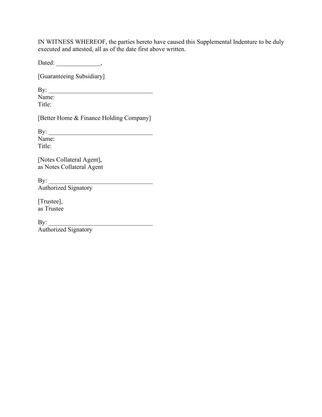 IN WITNESS WHEREOF, the parties hereto have caused this Supplemental Indenture to be duly executed and attested, all as of the date first above written. Dated: ______________, [Guaranteeing Subsidiary] By: _________________________________ Name: Title: [Better Home & Finance Holding Company] By: _________________________________ Name: Title: [Notes Collateral Agent], as Notes Collateral Agent By: _________________________________ Authorized Signatory [Trustee], as Trustee By: _________________________________ Authorized Signatory