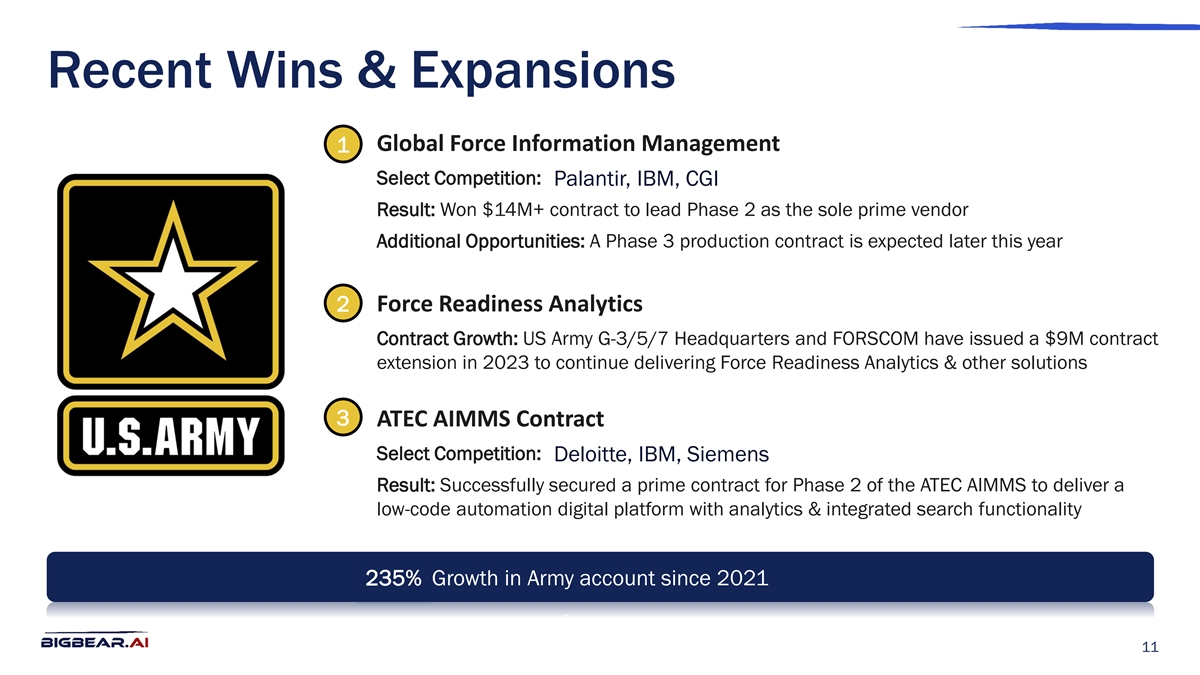 Recent Wins & Expansions International Maritime Exercise 23: Successfully demonstrated AI/Machine Learning (ML)-powered decision support solution at IMX 23 with Task Force 59 BigBear.ai will serve as L3Harris’ exclusive provider of: DoD’s Chief Digital and Artificial Intelligence Office’s Tradewind Initiative: 1 Computer Vision Announced the addition of our Ursa Minor and 2 Predictive Analytics Observe solutions to the DoD Tradewind marketplace 3 Event Alerting & Descriptive Analytics Global Force Information Management Phase 2: For autonomous surface vessels and associated shore-based command & control maritime operations Selected as the prime contractor to grow a $2 million systems for the Department of Defense (DoD) award for a second prototype into a $14.8 million award to deliver a minimum viable product 10
