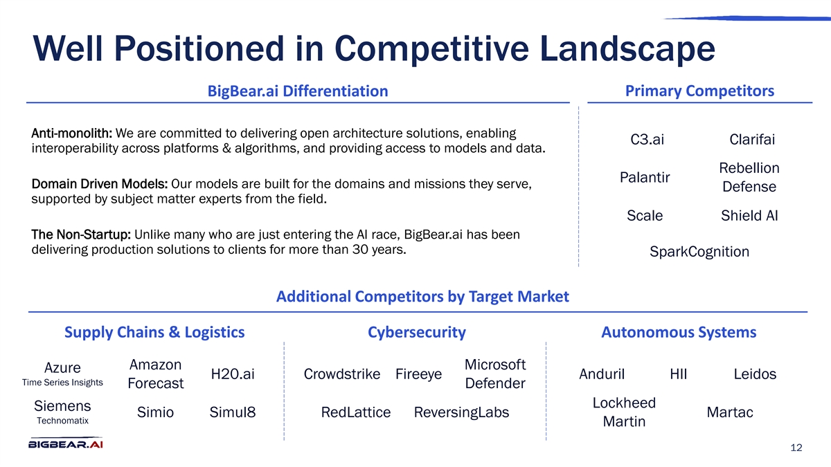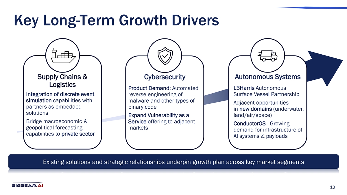 Well Positioned in Competitive Landscape Primary Competitors BigBear.ai Differentiation Anti-monolith: We are committed to delivering open architecture solutions, enabling C3.ai Clarifai interoperability across platforms & algorithms, and providing access to models and data. Rebellion Palantir Domain Driven Models: Our models are built for the domains and missions they serve, Defense supported by subject matter experts from the field. Scale Shield AI The Non-Startup: Unlike many who are just entering the AI race, BigBear.ai has been delivering production solutions to clients for more than 30 years. SparkCognition Additional Competitors by Target Market Supply Chains & Logistics Cybersecurity Autonomous Systems Amazon Microsoft Azure H20.ai Crowdstrike Fireeye Anduril HII Leidos Time Series Insights Forecast Defender Lockheed Siemens Simio Simul8 RedLattice ReversingLabs Martac Technomatix Martin 12