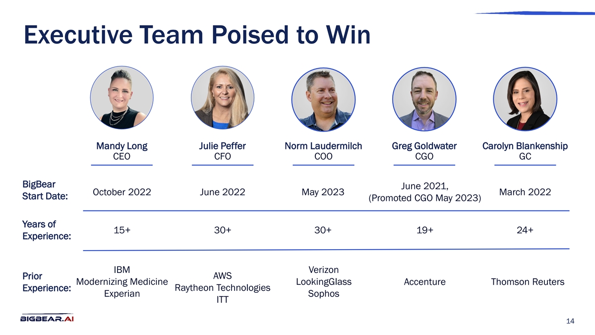 Executive Team Poised to Win Mandy Long Julie Peffer Norm Laudermilch Greg Goldwater Carolyn Blankenship CEO CFO COO CGO GC BigBear June 2021, October 2022 June 2022 May 2023 March 2022 Start Date: (Promoted CGO May 2023) Years of 15+ 30+ 30+ 19+ 24+ Experience: IBM Verizon Prior AWS Modernizing Medicine LookingGlass Accenture Thomson Reuters Raytheon Technologies Experience: Experian Sophos ITT 14