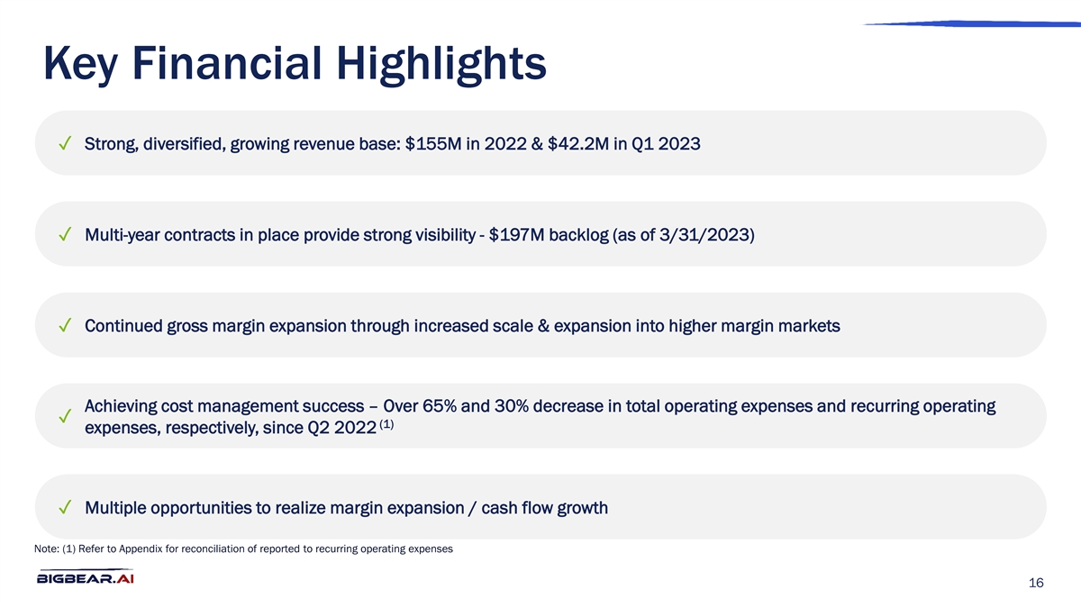 Key Financial Highlights ✓ Strong, diversified, growing revenue base: $155M in 2022 & $42.2M in Q1 2023 ✓ Multi-year contracts in place provide strong visibility - $197M backlog (as of 3/31/2023) ✓ Continued gross margin expansion through increased scale & expansion into higher margin markets Achieving cost management success – Over 65% and 30% decrease in total operating expenses and recurring operating ✓ (1) expenses, respectively, since Q2 2022 ✓ Multiple opportunities to realize margin expansion / cash flow growth Note: (1) Refer to Appendix for reconciliation of reported to recurring operating expenses 16