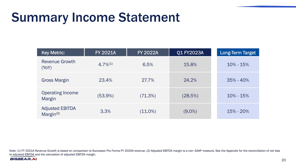 Summary Income Statement Key Metric: FY 2021A FY 2022A Q1 FY2023A Long-Term Target Revenue Growth (1) 4.7% 6.5% 15.8% 10% - 15% (YoY) Gross Margin 23.4% 27.7% 24.2% 35% - 40% Operating Income (53.9%) (71.3%) (28.5%) 10% - 15% Margin Adjusted EBITDA 3.3% (11.0%) (9.0%) 15% - 20% (2) Margin Note: (1) FY 2021A Revenue Growth is based on comparison to Successor Pro Forma FY 2020A revenue. (2) Adjusted EBITDA margin is a non- GAAP measure. See the Appendix for the reconciliation of net loss to adjusted EBITDA and the calculation of adjusted EBITDA margin. 20