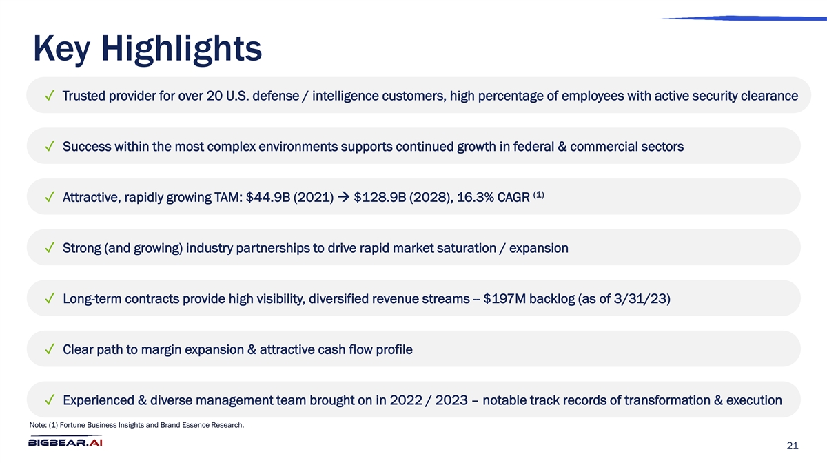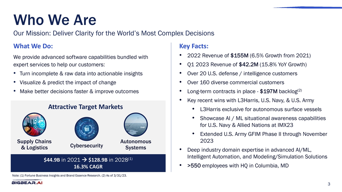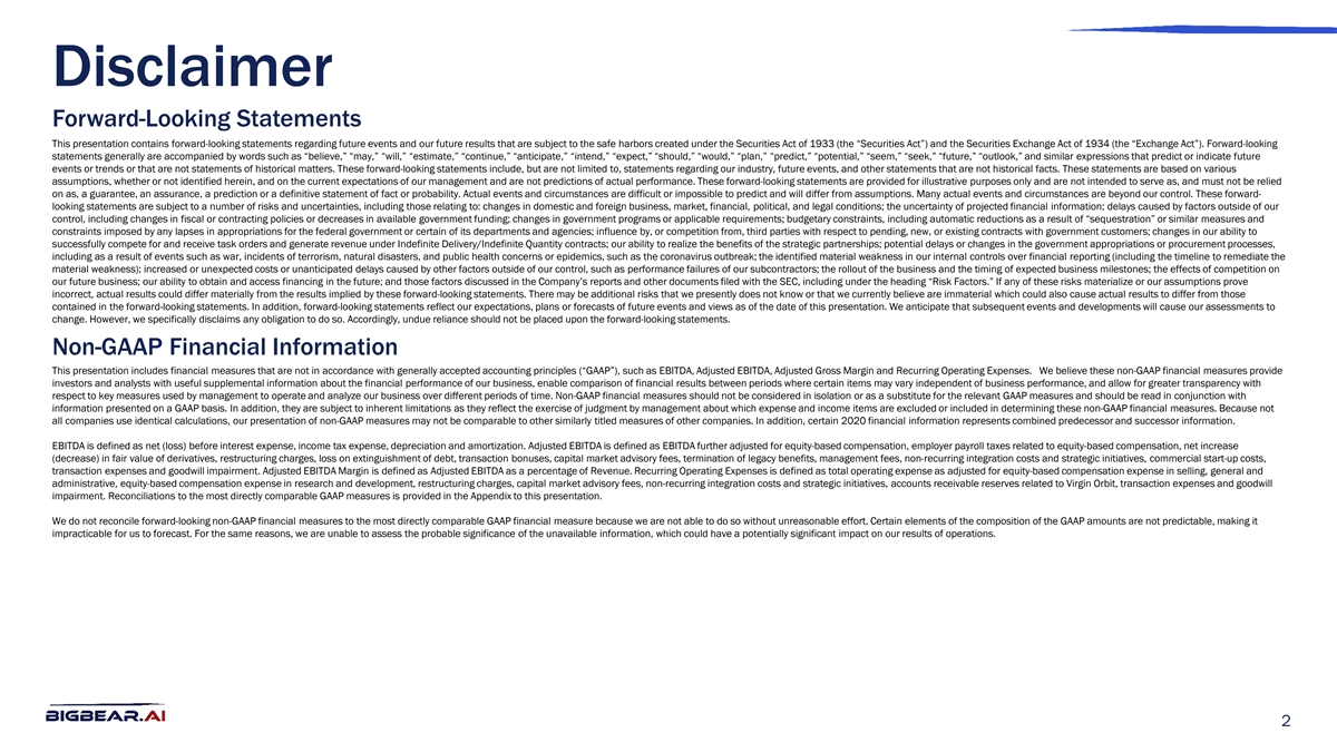 Disclaimer Forward-Looking Statements This presentation contains forward-looking statements regarding future events and our future results that are subject to the safe harbors created under the Securities Act of 1933 (the “Securities Act”) and the Securities Exchange Act of 1934 (the “Exchange Act”). Forward-looking statements generally are accompanied by words such as “believe,” “may,” “will,” “estimate,” “continue,” “anticipate,” “intend,” “expect,” “should,” “would,” “plan,” “predict,” “potential,” “seem,” “seek,” “future,” “outlook,” and similar expressions that predict or indicate future events or trends or that are not statements of historical matters. These forward-looking statements include, but are not limited to, statements regarding our industry, future events, and other statements that are not historical facts. These statements are based on various assumptions, whether or not identified herein, and on the current expectations of our management and are not predictions of actual performance. These forward-looking statements are provided for illustrative purposes only and are not intended to serve as, and must not be relied on as, a guarantee, an assurance, a prediction or a definitive statement of fact or probability. Actual events and circumstances are difficult or impossible to predict and will differ from assumptions. Many actual events and circumstances are beyond our control. These forward- looking statements are subject to a number of risks and uncertainties, including those relating to: changes in domestic and foreign business, market, financial, political, and legal conditions; the uncertainty of projected financial information; delays caused by factors outside of our control, including changes in fiscal or contracting policies or decreases in available government funding; changes in government programs or applicable requirements; budgetary constraints, including automatic reductions as a result of “sequestration” or similar measures and constraints imposed by any lapses in appropriations for the federal government or certain of its departments and agencies; influence by, or competition from, third parties with respect to pending, new, or existing contracts with government customers; changes in our ability to successfully compete for and receive task orders and generate revenue under Indefinite Delivery/Indefinite Quantity contracts; our ability to realize the benefits of the strategic partnerships; potential delays or changes in the government appropriations or procurement processes, including as a result of events such as war, incidents of terrorism, natural disasters, and public health concerns or epidemics, such as the coronavirus outbreak; the identified material weakness in our internal controls over financial reporting (including the timeline to remediate the material weakness); increased or unexpected costs or unanticipated delays caused by other factors outside of our control, such as performance failures of our subcontractors; the rollout of the business and the timing of expected business milestones; the effects of competition on our future business; our ability to obtain and access financing in the future; and those factors discussed in the Company’s reports and other documents filed with the SEC, including under the heading “Risk Factors.” If any of these risks materialize or our assumptions prove incorrect, actual results could differ materially from the results implied by these forward-looking statements. There may be additional risks that we presently does not know or that we currently believe are immaterial which could also cause actual results to differ from those contained in the forward-looking statements. In addition, forward-looking statements reflect our expectations, plans or forecasts of future events and views as of the date of this presentation. We anticipate that subsequent events and developments will cause our assessments to change. However, we specifically disclaims any obligation to do so. Accordingly, undue reliance should not be placed upon the forward-looking statements. Non-GAAP Financial Information This presentation includes financial measures that are not in accordance with generally accepted accounting principles (“GAAP”), such as EBITDA, Adjusted EBITDA, Adjusted Gross Margin and Recurring Operating Expenses. We believe these non-GAAP financial measures provide investors and analysts with useful supplemental information about the financial performance of our business, enable comparison of financial results between periods where certain items may vary independent of business performance, and allow for greater transparency with respect to key measures used by management to operate and analyze our business over different periods of time. Non-GAAP financial measures should not be considered in isolation or as a substitute for the relevant GAAP measures and should be read in conjunction with information presented on a GAAP basis. In addition, they are subject to inherent limitations as they reflect the exercise of judgment by management about which expense and income items are excluded or included in determining these non-GAAP financial measures. Because not all companies use identical calculations, our presentation of non-GAAP measures may not be comparable to other similarly titled measures of other companies. In addition, certain 2020 financial information represents combined predecessor and successor information. EBITDA is defined as net (loss) before interest expense, income tax expense, depreciation and amortization. Adjusted EBITDA is defined as EBITDA further adjusted for equity-based compensation, employer payroll taxes related to equity-based compensation, net increase (decrease) in fair value of derivatives, restructuring charges, loss on extinguishment of debt, transaction bonuses, capital market advisory fees, termination of legacy b