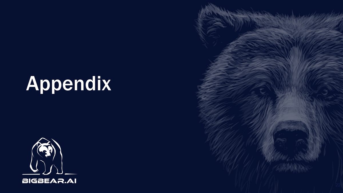 Key Highlights ✓ Trusted provider for over 20 U.S. defense / intelligence customers, high percentage of employees with active security clearance ✓ Success within the most complex environments supports continued growth in federal & commercial sectors (1) ✓ Attractive, rapidly growing TAM: $44.9B (2021) à $128.9B (2028), 16.3% CAGR ✓ Strong (and growing) industry partnerships to drive rapid market saturation / expansion ✓ Long-term contracts provide high visibility, diversified revenue streams -- $197M backlog (as of 3/31/23) ✓ Clear path to margin expansion & attractive cash flow profile ✓ Experienced & diverse management team brought on in 2022 / 2023 – notable track records of transformation & execution Note: (1) Fortune Business Insights and Brand Essence Research. 21