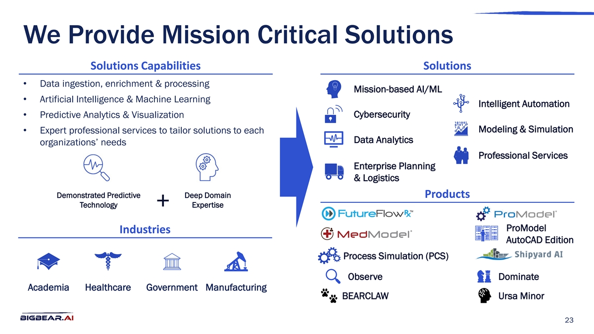 We Provide Mission Critical Solutions Solutions Capabilities Solutions • Data ingestion, enrichment & processing Mission-based AI/ML • Artificial Intelligence & Machine Learning Intelligent Automation Cybersecurity • Predictive Analytics & Visualization Modeling & Simulation • Expert professional services to tailor solutions to each Data Analytics organizations’ needs Professional Services Enterprise Planning & Logistics Demonstrated Predictive Deep Domain Products Technology Expertise + ProModel Industries AutoCAD Edition Process Simulation (PCS) Observe Dominate Academia Healthcare Government Manufacturing BEARCLAW Ursa Minor 23