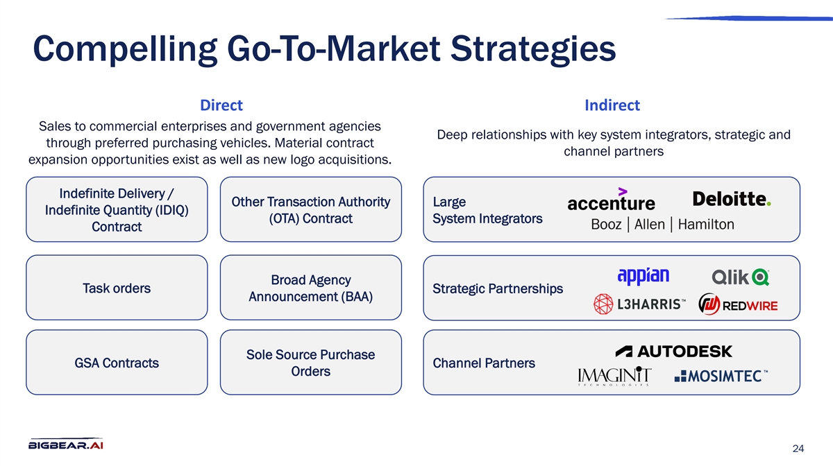 Compelling Go-To-Market Strategies Direct Indirect Sales to commercial enterprises and government agencies Deep relationships with key system integrators, strategic and through preferred purchasing vehicles. Material contract channel partners expansion opportunities exist as well as new logo acquisitions. Indefinite Delivery / Other Transaction Authority Large Indefinite Quantity (IDIQ) (OTA) Contract System Integrators Contract Broad Agency Task orders Strategic Partnerships Announcement (BAA) Sole Source Purchase GSA Contracts Channel Partners Orders 24