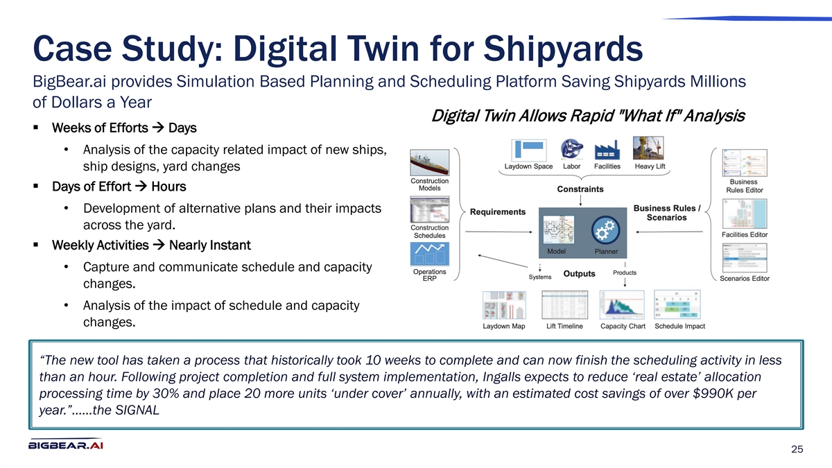 Case Study: Digital Twin for Shipyards BigBear.ai provides Simulation Based Planning and Scheduling Platform Saving Shipyards Millions of Dollars a Year Digital Twin Allows Rapid What If Analysis § Weeks of Efforts à Days • Analysis of the capacity related impact of new ships, ship designs, yard changes § Days of Effort à Hours • Development of alternative plans and their impacts across the yard. § Weekly Activities à Nearly Instant • Capture and communicate schedule and capacity changes. • Analysis of the impact of schedule and capacity changes. “The new tool has taken a process that historically took 10 weeks to complete and can now finish the scheduling activity in less than an hour. Following project completion and full system implementation, Ingalls expects to reduce ‘real estate’ allocation processing time by 30% and place 20 more units ‘under cover’ annually, with an estimated cost savings of over $990K per year.”......the SIGNAL 25