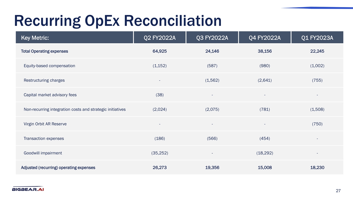 Recurring OpEx Reconciliation Key Metric: Q2 FY2022A Q3 FY2022A Q4 FY2022A Q1 FY2023A Total Operating expenses 64,925 24,146 38,156 22,245 Equity-based compensation (1,152) (587) (980) (1,002) Restructuring charges - (1,562) (2,641) (755) Capital market advisory fees (38) - - - Non-recurring integration costs and strategic initiatives (2,024) (2,075) (781) (1,508) Virgin Orbit AR Reserve - - - (750) Transaction expenses (186) (566) (454) - Goodwill impairment (35,252) - (18,292) - Adjusted (recurring) operating expenses 26,273 19,356 15,008 18,230 27