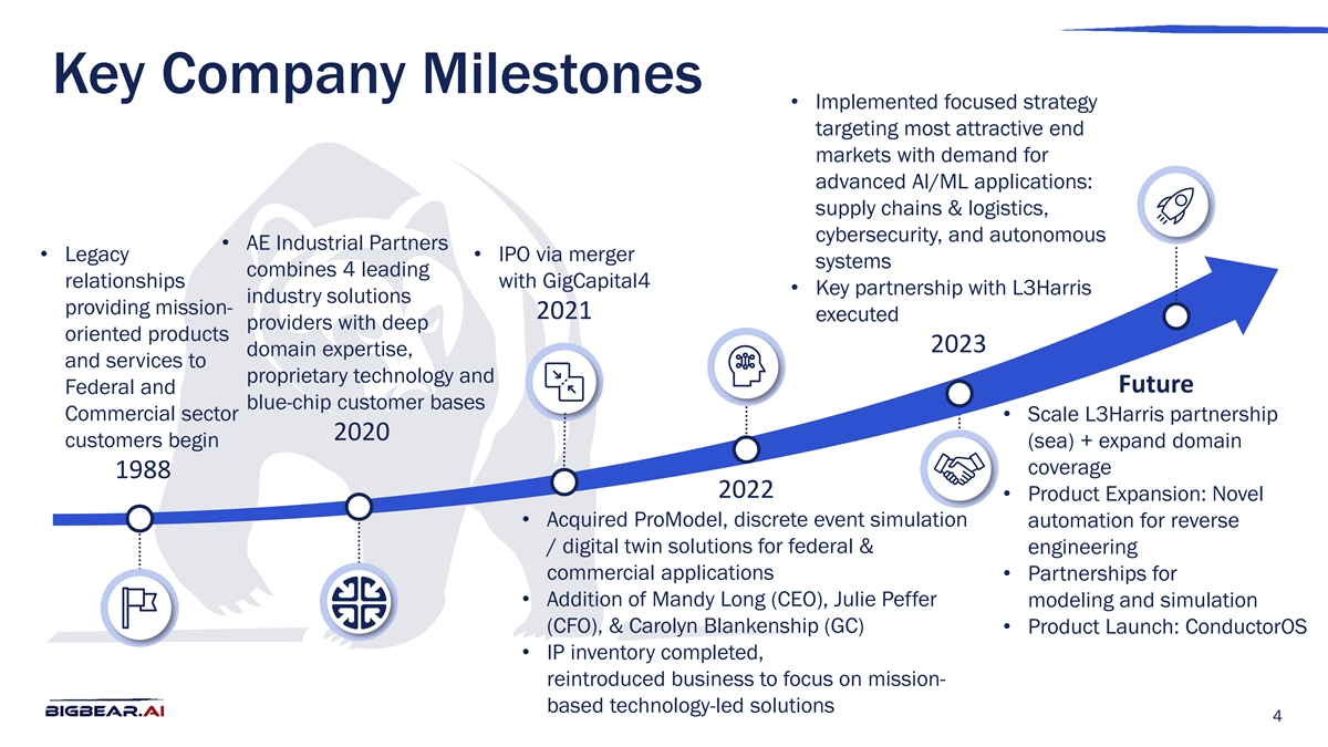 Key Company Milestones • Implemented focused strategy targeting most attractive end markets with demand for advanced AI/ML applications: supply chains & logistics, cybersecurity, and autonomous • AE Industrial Partners • Legacy • IPO via merger systems combines 4 leading relationships with GigCapital4 • Key partnership with L3Harris industry solutions providing mission- 2021 executed providers with deep oriented products 2023 domain expertise, and services to proprietary technology and Future Federal and blue-chip customer bases Commercial sector • Scale L3Harris partnership 2020 customers begin (sea) + expand domain coverage 1988 2022 • Product Expansion: Novel • Acquired ProModel, discrete event simulation automation for reverse / digital twin solutions for federal & engineering commercial applications • Partnerships for • Addition of Mandy Long (CEO), Julie Peffer modeling and simulation (CFO), & Carolyn Blankenship (GC) • Product Launch: ConductorOS • IP inventory completed, reintroduced business to focus on mission- based technology-led solutions 4