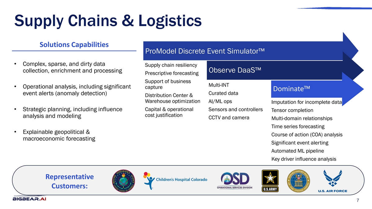 Supply Chains & Logistics Solutions Capabilities ProModel Discrete Event Simulator™ • Complex, sparse, and dirty data Supply chain resiliency collection, enrichment and processing Observe DaaS™ Prescriptive forecasting Support of business Multi-INT • Operational analysis, including significant capture Dominate™ Curated data event alerts (anomaly detection) Distribution Center & Warehouse optimization AI/ML ops Imputation for incomplete data • Strategic planning, including influence Capital & operational Sensors and controllers Tensor completion cost justification analysis and modeling CCTV and camera Multi-domain relationships Time series forecasting • Explainable geopolitical & Course of action (COA) analysis macroeconomic forecasting Significant event alerting Automated ML pipeline Key driver influence analysis Representative Customers: 7