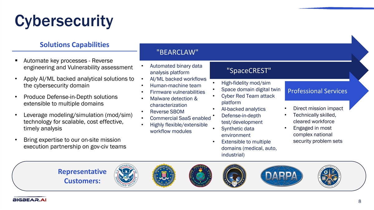 Cybersecurity Solutions Capabilities BEARCLAW § Automate key processes - Reverse • Automated binary data engineering and Vulnerability assessment SpaceCREST analysis platform • Apply AI/ML backed analytical solutions to • AI/ML backed workflows • High-fidelity mod/sim the cybersecurity domain • Human-machine team • Space domain digital twin Professional Services • Firmware vulnerabilities • Cyber Red Team attack • Produce Defense-in-Depth solutions • Malware detection & platform extensible to multiple domains characterization • Direct mission impact • AI-backed analytics • Reverse SBOM • Technically skilled, • Leverage modeling/simulation (mod/sim) • Defense-in-depth • Commercial SaaS enabled cleared workforce technology for scalable, cost effective, test/development • Highly flexible/extensible • Engaged in most timely analysis • Synthetic data workflow modules complex national environment • Bring expertise to our on-site mission security problem sets • Extensible to multiple execution partnership on gov-civ teams domains (medical, auto, industrial) Representative Customers: 8