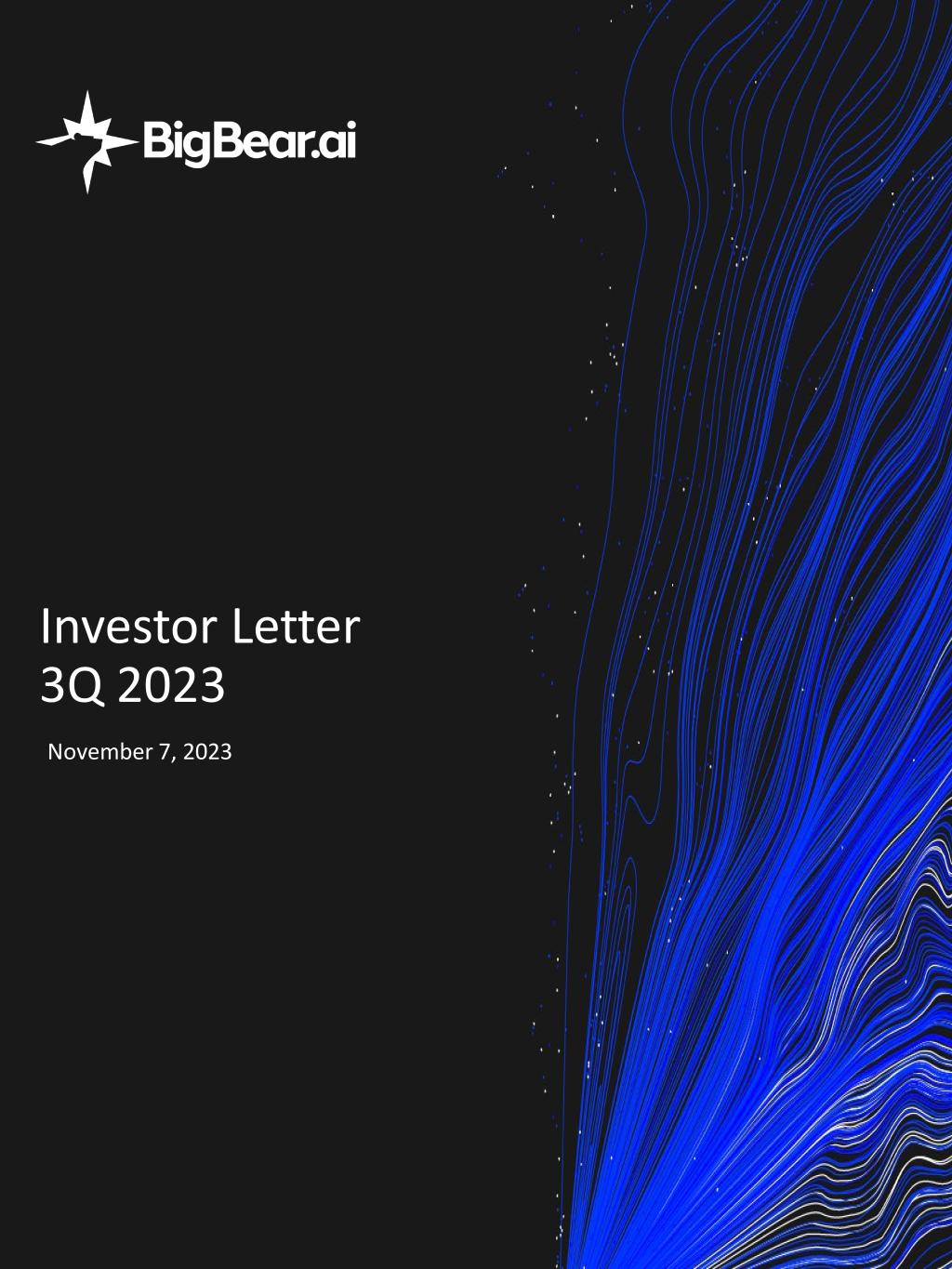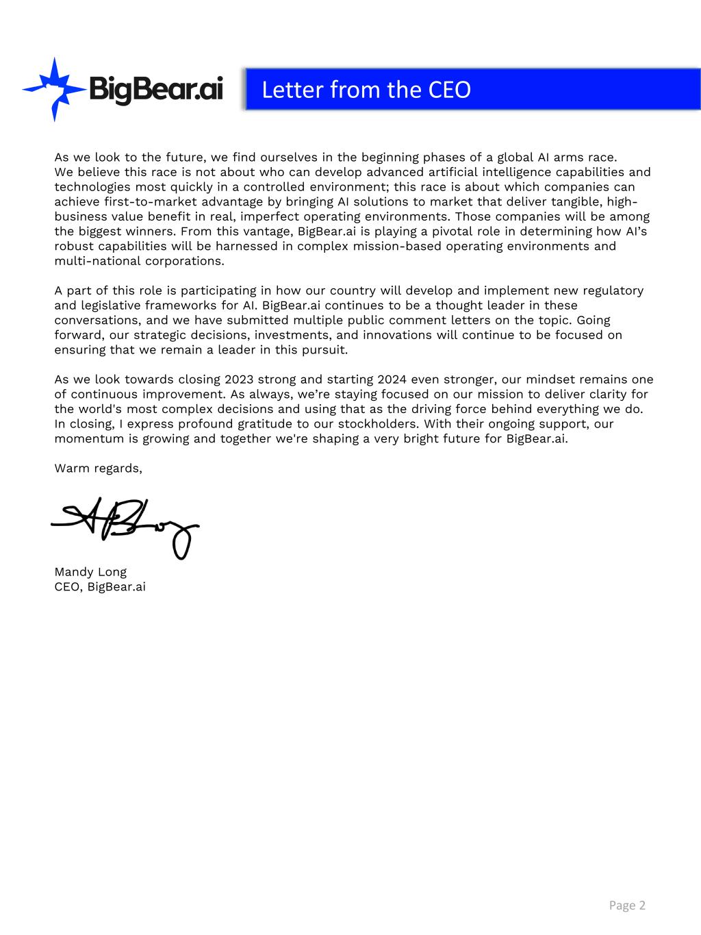 As we look to the future, we find ourselves in the beginning phases of a global AI arms race. We believe this race is not about who can develop advanced artificial intelligence capabilities and technologies most quickly in a controlled environment; this race is about which companies can achieve first-to-market advantage by bringing AI solutions to market that deliver tangible, high- business value benefit in real, imperfect operating environments. Those companies will be among the biggest winners. From this vantage, BigBear.ai is playing a pivotal role in determining how AI’s robust capabilities will be harnessed in complex mission-based operating environments and multi-national corporations. A part of this role is participating in how our country will develop and implement new regulatory and legislative frameworks for AI. BigBear.ai continues to be a thought leader in these conversations, and we have submitted multiple public comment letters on the topic. Going forward, our strategic decisions, investments, and innovations will continue to be focused on ensuring that we remain a leader in this pursuit. As we look towards closing 2023 strong and starting 2024 even stronger, our mindset remains one of continuous improvement. As always, we’re staying focused on our mission to deliver clarity for the world's most complex decisions and using that as the driving force behind everything we do. In closing, I express profound gratitude to our stockholders. With their ongoing support, our momentum is growing and together we're shaping a very bright future for BigBear.ai. Warm regards, Mandy Long CEO, BigBear.ai Page 2 Letter from the CEO