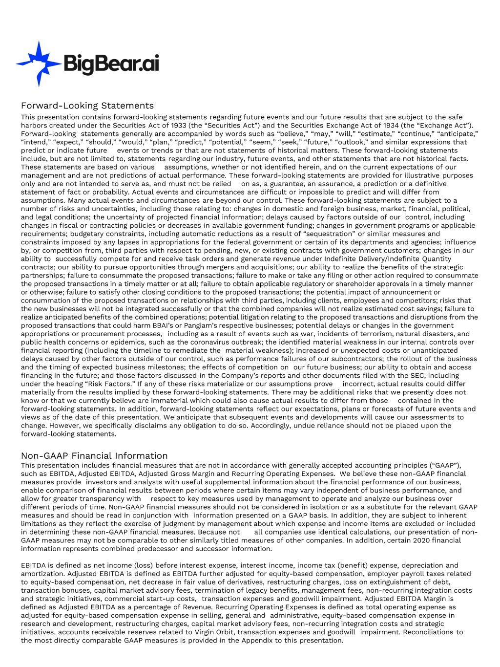 Forward-Looking Statements This presentation contains forward-looking statements regarding future events and our future results that are subject to the safe harbors created under the Securities Act of 1933 (the “Securities Act”) and the Securities Exchange Act of 1934 (the “Exchange Act”). Forward-looking statements generally are accompanied by words such as “believe,” “may,” “will,” “estimate,” “continue,” “anticipate,” “intend,” “expect,” “should,” “would,” “plan,” “predict,” “potential,” “seem,” “seek,” “future,” “outlook,” and similar expressions that predict or indicate future events or trends or that are not statements of historical matters. These forward-looking statements include, but are not limited to, statements regarding our industry, future events, and other statements that are not historical facts. These statements are based on various assumptions, whether or not identified herein, and on the current expectations of our management and are not predictions of actual performance. These forward-looking statements are provided for illustrative purposes only and are not intended to serve as, and must not be relied on as, a guarantee, an assurance, a prediction or a definitive statement of fact or probability. Actual events and circumstances are difficult or impossible to predict and will differ from assumptions. Many actual events and circumstances are beyond our control. These forward-looking statements are subject to a number of risks and uncertainties, including those relating to: changes in domestic and foreign business, market, financial, political, and legal conditions; the uncertainty of projected financial information; delays caused by factors outside of our control, including changes in fiscal or contracting policies or decreases in available government funding; changes in government programs or applicable requirements; budgetary constraints, including automatic reductions as a result of “sequestration” or similar measures and constraints imposed by any lapses in appropriations for the federal government or certain of its departments and agencies; influence by, or competition from, third parties with respect to pending, new, or existing contracts with government customers; changes in our ability to successfully compete for and receive task orders and generate revenue under Indefinite Delivery/Indefinite Quantity contracts; our ability to pursue opportunities through mergers and acquisitions; our ability to realize the benefits of the strategic partnerships; failure to consummate the proposed transactions; failure to make or take any filing or other action required to consummate the proposed transactions in a timely matter or at all; failure to obtain applicable regulatory or shareholder approvals in a timely manner or otherwise; failure to satisfy other closing conditions to the proposed transactions; the potential impact of announcement or consummation of the proposed transactions on relationships with third parties, including clients, employees and competitors; risks that the new businesses will not be integrated successfully or that the combined companies will not realize estimated cost savings; failure to realize anticipated benefits of the combined operations; potential litigation relating to the proposed transactions and disruptions from the proposed transactions that could harm BBAI’s or Pangiam’s respective businesses; potential delays or changes in the government appropriations or procurement processes, including as a result of events such as war, incidents of terrorism, natural disasters, and public health concerns or epidemics, such as the coronavirus outbreak; the identified material weakness in our internal controls over financial reporting (including the timeline to remediate the material weakness); increased or unexpected costs or unanticipated delays caused by other factors outside of our control, such as performance failures of our subcontractors; the rollout of the business and the timing of expected business milestones; the effects of competition on our future business; our ability to obtain and access financing in the future; and those factors discussed in the Company’s reports and other documents filed with the SEC, including under the heading “Risk Factors.” If any of these risks materialize or our assumptions prove incorrect, actual results could differ materially from the results implied by these forward-looking statements. There may be additional risks that we presently does not know or that we currently believe are immaterial which could also cause actual results to differ from those contained in the forward-looking statements. In addition, forward-looking statements reflect our expectations, plans or forecasts of future events and views as of the date of this presentation. We anticipate that subsequent events and developments will cause our assessments to change. However, we specifically disclaims any obligation to do so. Accordingly, undue reliance should not be placed upon the forward-looking statements. Non-GAAP Financial Information This presentation includes financial measures that are not in accordance with generally accepted accounting principles (“GAAP”), such as EBITDA, Adjusted EBITDA, Adjusted Gross Margin and Recurring Operating Expenses. We believe these non-GAAP financial measures provide investors and analysts with useful supplemental information about the financial performance of our business, enable comparison of financial results between periods where certain items may vary independent of business performance, and allow for greater transparency with respect to key measures used by management to operate and analyze our business over different periods of time. Non-GAAP financial measures should not be considered in isolation or as a substitute for the relevant GAAP measures and should be read in conjunction with information presented on