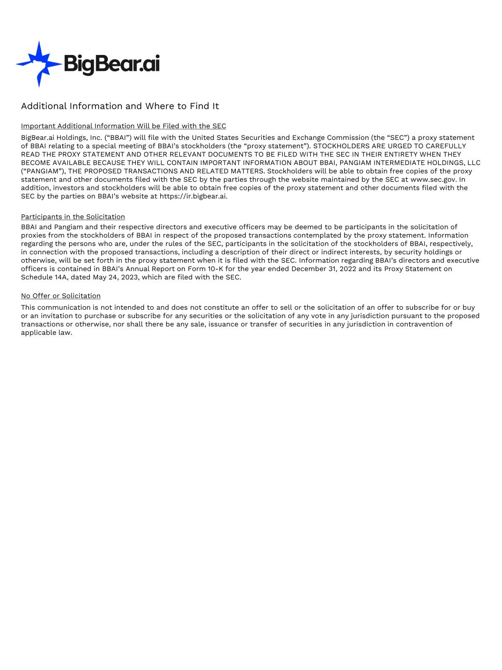 Additional Information and Where to Find It Important Additional Information Will be Filed with the SEC BigBear.ai Holdings, Inc. (“BBAI”) will file with the United States Securities and Exchange Commission (the “SEC”) a proxy statement of BBAI relating to a special meeting of BBAI’s stockholders (the “proxy statement”). STOCKHOLDERS ARE URGED TO CAREFULLY READ THE PROXY STATEMENT AND OTHER RELEVANT DOCUMENTS TO BE FILED WITH THE SEC IN THEIR ENTIRETY WHEN THEY BECOME AVAILABLE BECAUSE THEY WILL CONTAIN IMPORTANT INFORMATION ABOUT BBAI, PANGIAM INTERMEDIATE HOLDINGS, LLC (“PANGIAM”), THE PROPOSED TRANSACTIONS AND RELATED MATTERS. Stockholders will be able to obtain free copies of the proxy statement and other documents filed with the SEC by the parties through the website maintained by the SEC at www.sec.gov. In addition, investors and stockholders will be able to obtain free copies of the proxy statement and other documents filed with the SEC by the parties on BBAI’s website at https://ir.bigbear.ai. Participants in the Solicitation BBAI and Pangiam and their respective directors and executive officers may be deemed to be participants in the solicitation of proxies from the stockholders of BBAI in respect of the proposed transactions contemplated by the proxy statement. Information regarding the persons who are, under the rules of the SEC, participants in the solicitation of the stockholders of BBAI, respectively, in connection with the proposed transactions, including a description of their direct or indirect interests, by security holdings or otherwise, will be set forth in the proxy statement when it is filed with the SEC. Information regarding BBAI’s directors and executive officers is contained in BBAI’s Annual Report on Form 10-K for the year ended December 31, 2022 and its Proxy Statement on Schedule 14A, dated May 24, 2023, which are filed with the SEC. No Offer or Solicitation This communication is not intended to and does not constitute an offer to sell or the solicitation of an offer to subscribe for or buy or an invitation to purchase or subscribe for any securities or the solicitation of any vote in any jurisdiction pursuant to the proposed transactions or otherwise, nor shall there be any sale, issuance or transfer of securities in any jurisdiction in contravention of applicable law.