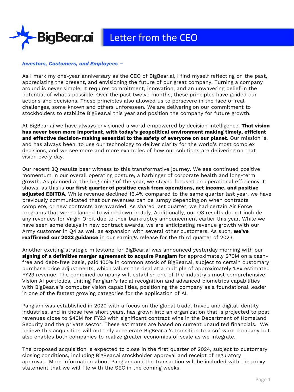 Letter from the CEO Investors, Customers, and Employees – As I mark my one-year anniversary as the CEO of BigBear.ai, I find myself reflecting on the past, appreciating the present, and envisioning the future of our great company. Turning a company around is never simple. It requires commitment, innovation, and an unwavering belief in the potential of what's possible. Over the past twelve months, these principles have guided our actions and decisions. These principles also allowed us to persevere in the face of real challenges, some known and others unforeseen. We are delivering on our commitment to stockholders to stabilize BigBear.ai this year and position the company for future growth. At BigBear.ai we have always envisioned a world empowered by decision intelligence. That vision has never been more important, with today’s geopolitical environment making timely, efficient and effective decision-making essential to the safety of everyone on our planet. Our mission is, and has always been, to use our technology to deliver clarity for the world’s most complex decisions, and we see more and more examples of how our solutions are delivering on that vision every day. Our recent 3Q results bear witness to this transformative journey. We see continued positive momentum in our overall operating posture, a harbinger of corporate health and long-term growth. As planned at the beginning of the year, we stayed focused on operational efficiency. It shows, as this is our first quarter of positive cash from operations, net income, and positive adjusted EBITDA. While revenue declined 16.4% compared to the same quarter last year, we have previously communicated that our revenues can be lumpy depending on when contracts complete, or new contracts are awarded. As shared last quarter, we had certain Air Force programs that were planned to wind-down in July. Additionally, our Q3 results do not include any revenues for Virgin Orbit due to their bankruptcy announcement earlier this year. While we have seen some delays in new contract awards, we are anticipating revenue growth with our Army customer in Q4 as well as expansion with several other customers. As such, we’ve reaffirmed our 2023 guidance in our earnings release for the third quarter of 2023. Another exciting strategic milestone for BigBear.ai was announced yesterday morning with our signing of a definitive merger agreement to acquire Pangiam for approximately $70M on a cash- free and debt-free basis, paid 100% in common stock of BigBear.ai, subject to certain customary purchase price adjustments, which values the deal at a multiple of approximately 1.8x estimated FY23 revenue. The combined company will establish one of the industry’s most comprehensive Vision AI portfolios, uniting Pangiam’s facial recognition and advanced biometrics capabilities with BigBear.ai's computer vision capabilities, positioning the company as a foundational leader in one of the fastest growing categories for the application of AI. Pangiam was established in 2020 with a focus on the global trade, travel, and digital identity industries, and in those few short years, has grown into an organization that is projected to post revenues close to $40M for FY23 with significant contract wins in the Department of Homeland Security and the private sector. These estimates are based on current unaudited financials. We believe this acquisition will not only accelerate BigBear.ai’s transition to a software company but also enables both companies to realize greater economies of scale as we integrate. The proposed acquisition is expected to close in the first quarter of 2024, subject to customary closing conditions, including BigBear.ai stockholder approval and receipt of regulatory approval. More information about Pangiam and the transaction will be included with the proxy statement that we will file with the SEC in the coming weeks. Page 1