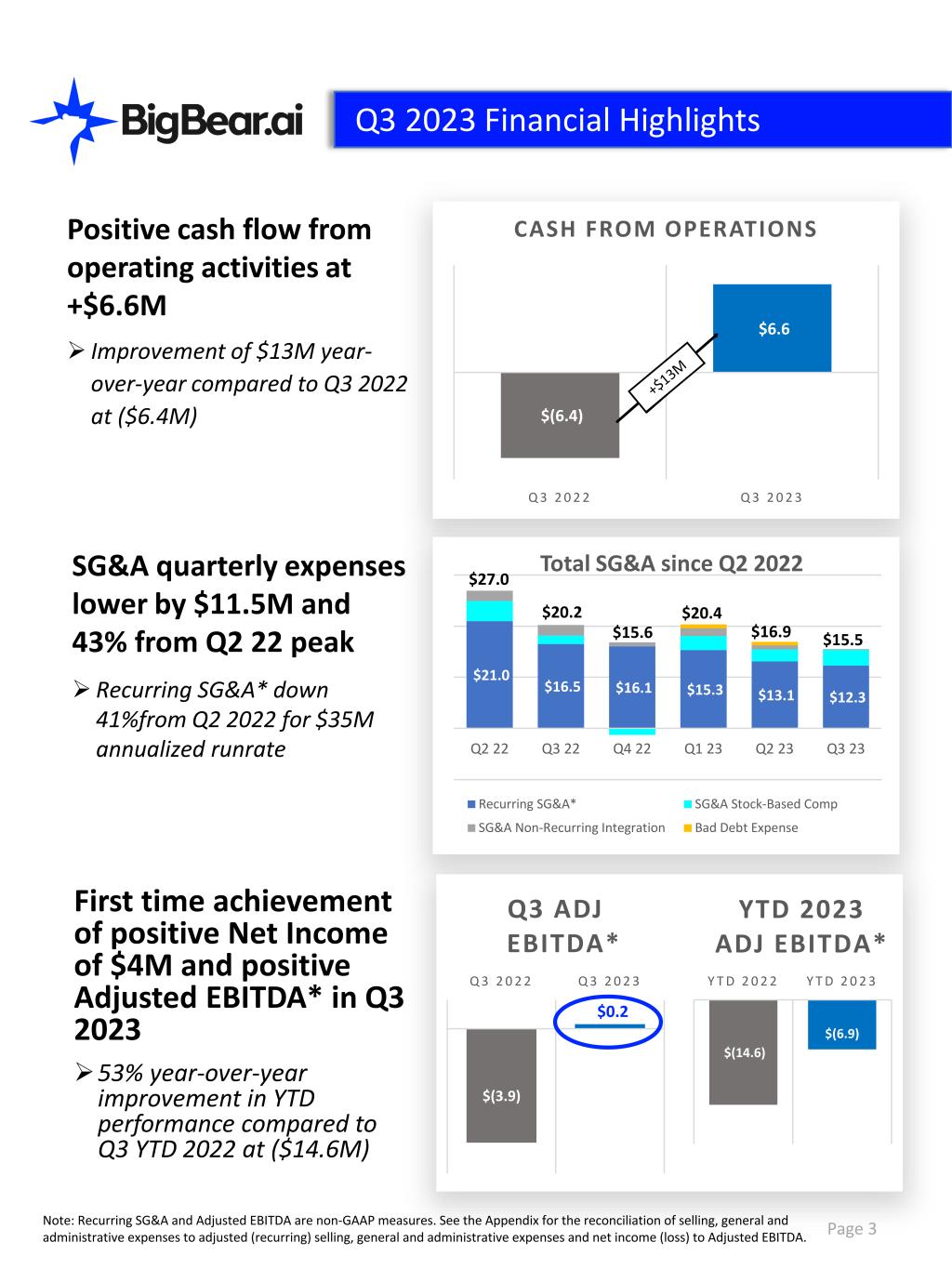 $21.0 $16.5 $16.1 $15.3 $13.1 $12.3 Q2 22 Q3 22 Q4 22 Q1 23 Q2 23 Q3 23 Total SG&A since Q2 2022 SG&A Stock-Based CompRecurring SG&A* SG&A Non-Recurring Integration Bad Debt Expense $(14.6) $(6.9) Y T D 2 0 2 2 Y T D 2 0 2 3 YTD 2023 ADJ EBITDA* Positive cash flow from operating activities at +$6.6M  Improvement of $13M year- over-year compared to Q3 2022 at ($6.4M) $(6.4) $6.6 Q 3 2 0 2 2 Q 3 2 0 2 3 CASH FROM OPERATIONS SG&A quarterly expenses lower by $11.5M and 43% from Q2 22 peak  Recurring SG&A* down 41%from Q2 2022 for $35M annualized runrate $27.0 $20.2 $15.6 $20.4 $16.9 $15.5 First time achievement of positive Net Income of $4M and positive Adjusted EBITDA* in Q3 2023 53% year-over-year improvement in YTD performance compared to Q3 YTD 2022 at ($14.6M) $(3.9) $0.2 Q 3 2 0 2 2 Q 3 2 0 2 3 Q3 ADJ EBITDA* Page 3 Q3 2023 Financial Highlights Note: Recurring SG&A and Adjusted EBITDA are non-GAAP measures. See the Appendix for the reconciliation of selling, general and administrative expenses to adjusted (recurring) selling, general and administrative expenses and net income (loss) to Adjusted EBITDA.