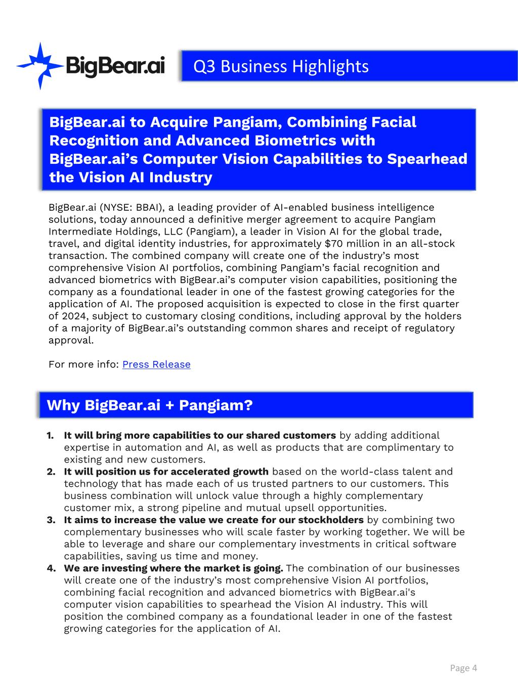 Page 4 BigBear.ai (NYSE: BBAI), a leading provider of AI-enabled business intelligence solutions, today announced a definitive merger agreement to acquire Pangiam Intermediate Holdings, LLC (Pangiam), a leader in Vision AI for the global trade, travel, and digital identity industries, for approximately $70 million in an all-stock transaction. The combined company will create one of the industry’s most comprehensive Vision AI portfolios, combining Pangiam’s facial recognition and advanced biometrics with BigBear.ai’s computer vision capabilities, positioning the company as a foundational leader in one of the fastest growing categories for the application of AI. The proposed acquisition is expected to close in the first quarter of 2024, subject to customary closing conditions, including approval by the holders of a majority of BigBear.ai’s outstanding common shares and receipt of regulatory approval. For more info: Press Release Why BigBear.ai + Pangiam? 1. It will bring more capabilities to our shared customers by adding additional expertise in automation and AI, as well as products that are complimentary to existing and new customers. 2. It will position us for accelerated growth based on the world-class talent and technology that has made each of us trusted partners to our customers. This business combination will unlock value through a highly complementary customer mix, a strong pipeline and mutual upsell opportunities. 3. It aims to increase the value we create for our stockholders by combining two complementary businesses who will scale faster by working together. We will be able to leverage and share our complementary investments in critical software capabilities, saving us time and money. 4. We are investing where the market is going. The combination of our businesses will create one of the industry’s most comprehensive Vision AI portfolios, combining facial recognition and advanced biometrics with BigBear.ai's computer vision capabilities to spearhead the Vision AI industry. This will position the combined company as a foundational leader in one of the fastest growing categories for the application of AI. BigBear.ai to Acquire Pangiam, Combining Facial Recognition and Advanced Biometrics with BigBear.ai’s Computer Vision Capabilities to Spearhead the Vision AI Industry Q3 Business Highlights