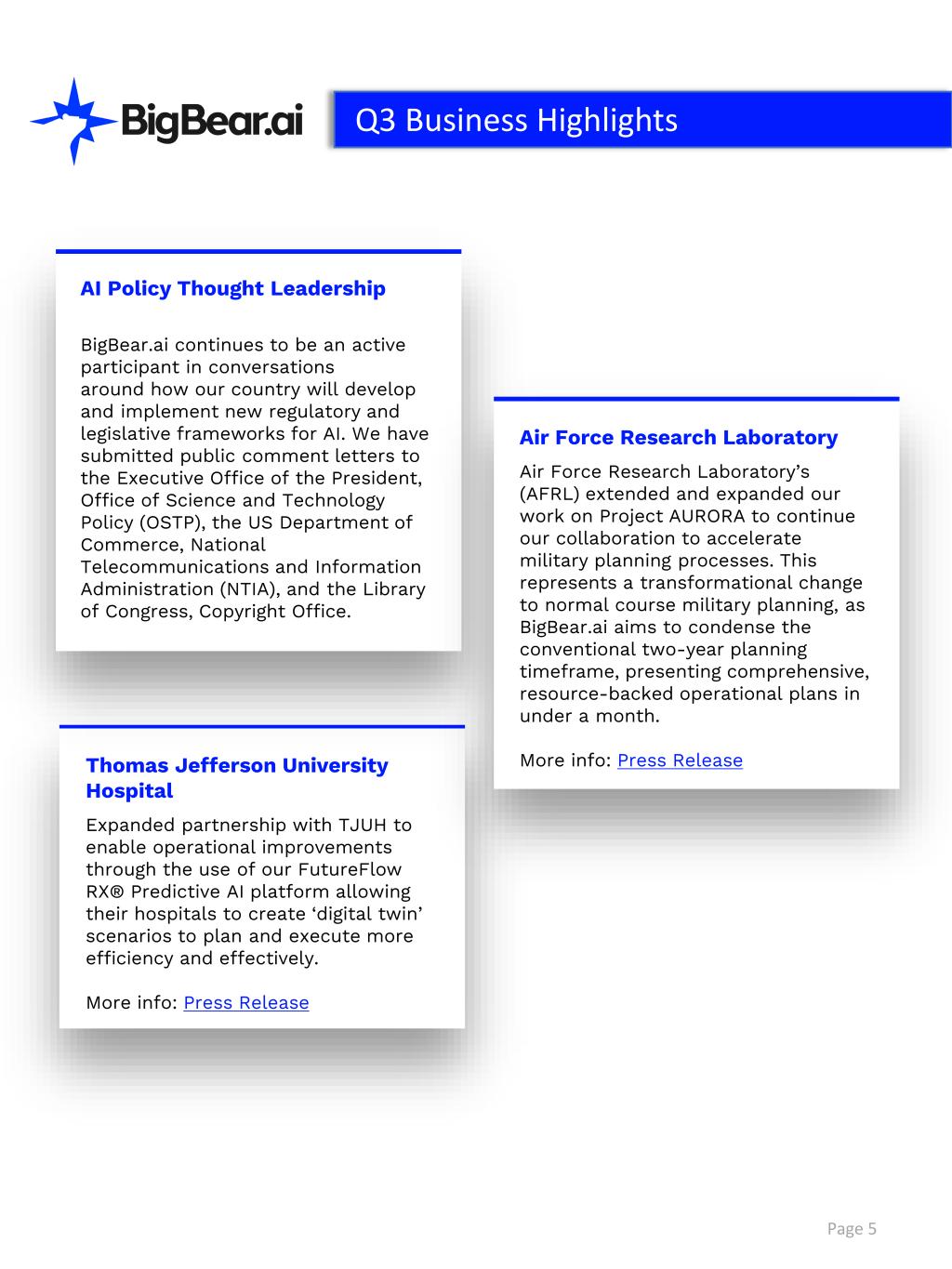 Thomas Jefferson University Hospital Expanded partnership with TJUH to enable operational improvements through the use of our FutureFlow RX® Predictive AI platform allowing their hospitals to create ‘digital twin’ scenarios to plan and execute more efficiency and effectively. More info: Press Release AI Policy Thought Leadership BigBear.ai continues to be an active participant in conversations around how our country will develop and implement new regulatory and legislative frameworks for AI. We have submitted public comment letters to the Executive Office of the President, Office of Science and Technology Policy (OSTP), the US Department of Commerce, National Telecommunications and Information Administration (NTIA), and the Library of Congress, Copyright Office. Page 5 Q3 Business Highlights Air Force Research Laboratory Air Force Research Laboratory’s (AFRL) extended and expanded our work on Project AURORA to continue our collaboration to accelerate military planning processes. This represents a transformational change to normal course military planning, as BigBear.ai aims to condense the conventional two-year planning timeframe, presenting comprehensive, resource-backed operational plans in under a month. More info: Press Release
