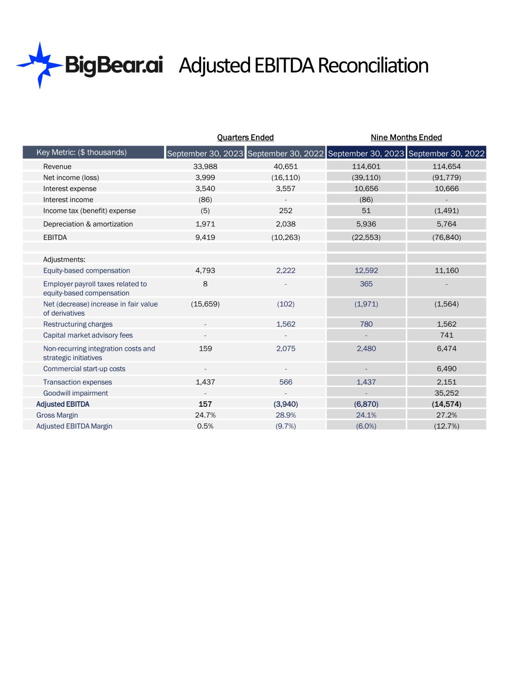 Adjusted EBITDA Reconciliation Quarters Ended Nine Months Ended Key Metric: ($ thousands) September 30, 2023 September 30, 2022 September 30, 2023 September 30, 2022 Revenue 33,988 40,651 114,601 114,654 Net income (loss) 3,999 (16,110) (39,110) (91,779) Interest expense 3,540 3,557 10,656 10,666 Interest income (86) - (86) - Income tax (benefit) expense (5) 252 51 (1,491) Depreciation & amortization 1,971 2,038 5,936 5,764 EBITDA 9,419 (10,263) (22,553) (76,840) Adjustments: Equity-based compensation 4,793 2,222 12,592 11,160 Employer payroll taxes related to equity-based compensation 8 - 365 - Net (decrease) increase in fair value of derivatives (15,659) (102) (1,971) (1,564) Restructuring charges - 1,562 780 1,562 Capital market advisory fees - - - 741 Non-recurring integration costs and strategic initiatives 159 2,075 2,480 6,474 Commercial start-up costs - - - 6,490 Transaction expenses 1,437 566 1,437 2,151 Goodwill impairment - - - 35,252 Adjusted EBITDA 157 (3,940) (6,870) (14,574) Gross Margin 24.7% 28.9% 24.1% 27.2% Adjusted EBITDA Margin 0.5% (9.7%) (6.0%) (12.7%)