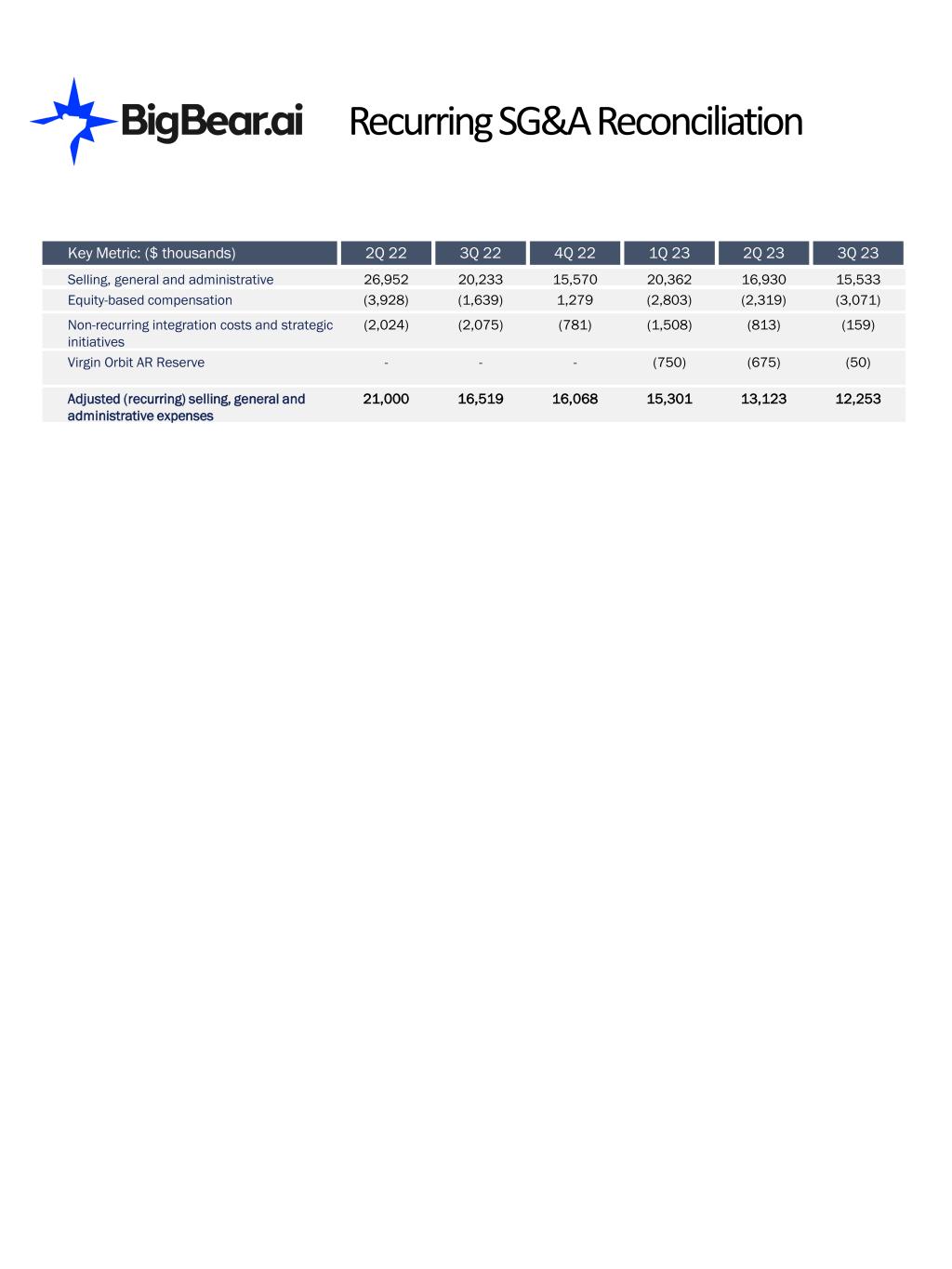 Recurring SG&A Reconciliation Key Metric: ($ thousands) 2Q 22 3Q 22 4Q 22 1Q 23 2Q 23 3Q 23 Selling, general and administrative 26,952 20,233 15,570 20,362 16,930 15,533 Equity-based compensation (3,928) (1,639) 1,279 (2,803) (2,319) (3,071) Non-recurring integration costs and strategic initiatives (2,024) (2,075) (781) (1,508) (813) (159) Virgin Orbit AR Reserve - - - (750) (675) (50) Adjusted (recurring) selling, general and administrative expenses 21,000 16,519 16,068 15,301 13,123 12,253