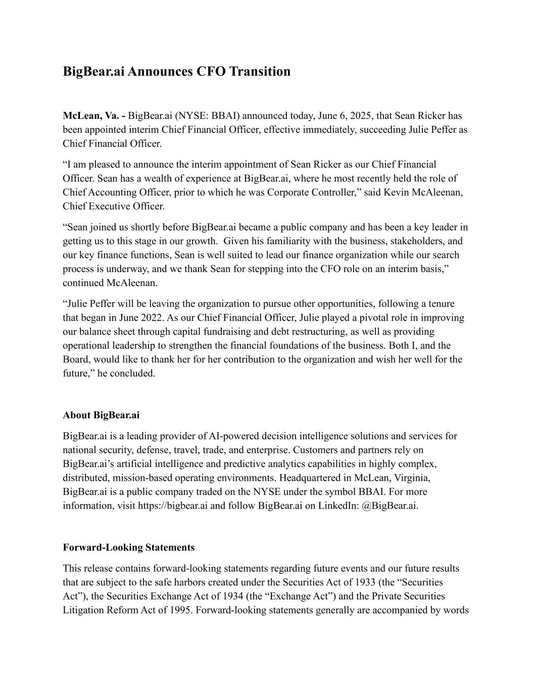 BigBear.ai Announces CFO Transition McLean, Va. - BigBear.ai (NYSE: BBAI) announced today, June 6, 2025, that Sean Ricker has been appointed interim Chief Financial Officer, effective immediately, succeeding Julie Peffer as Chief Financial Officer. “I am pleased to announce the interim appointment of Sean Ricker as our Chief Financial Officer. Sean has a wealth of experience at BigBear.ai, where he most recently held the role of Chief Accounting Officer, prior to which he was Corporate Controller,” said Kevin McAleenan, Chief Executive Officer. “Sean joined us shortly before BigBear.ai became a public company and has been a key leader in getting us to this stage in our growth. Given his familiarity with the business, stakeholders, and our key finance functions, Sean is well suited to lead our finance organization while our search process is underway, and we thank Sean for stepping into the CFO role on an interim basis,” continued McAleenan. “Julie Peffer will be leaving the organization to pursue other opportunities, following a tenure that began in June 2022. As our Chief Financial Officer, Julie played a pivotal role in improving our balance sheet through capital fundraising and debt restructuring, as well as providing operational leadership to strengthen the financial foundations of the business. Both I, and the Board, would like to thank her for her contribution to the organization and wish her well for the future,” he concluded. About BigBear.ai BigBear.ai is a leading provider of AI-powered decision intelligence solutions and services for national security, defense, travel, trade, and enterprise. Customers and partners rely on BigBear.ai’s artificial intelligence and predictive analytics capabilities in highly complex, distributed, mission-based operating environments. Headquartered in McLean, Virginia, BigBear.ai is a public company traded on the NYSE under the symbol BBAI. For more information, visit https://bigbear.ai and follow BigBear.ai on LinkedIn: @BigBear.ai. Forward-Looking Statements This release contains forward-looking statements regarding future events and our future results that are subject to the safe harbors created under the Securities Act of 1933 (the “Securities Act”), the Securities Exchange Act of 1934 (the “Exchange Act”) and the Private Securities Litigation Reform Act of 1995. Forward-looking statements generally are accompanied by words