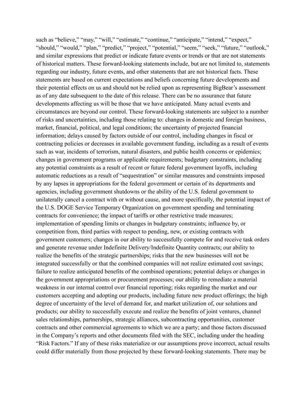 such as “believe,” “may,” “will,” “estimate,” “continue,” “anticipate,” “intend,” “expect,” “should,” “would,” “plan,” “predict,” “project,” “potential,” “seem,” “seek,” “future,” “outlook,” and similar expressions that predict or indicate future events or trends or that are not statements of historical matters. These forward-looking statements include, but are not limited to, statements regarding our industry, future events, and other statements that are not historical facts. These statements are based on current expectations and beliefs concerning future developments and their potential effects on us and should not be relied upon as representing BigBear’s assessment as of any date subsequent to the date of this release. There can be no assurance that future developments affecting us will be those that we have anticipated. Many actual events and circumstances are beyond our control. These forward-looking statements are subject to a number of risks and uncertainties, including those relating to: changes in domestic and foreign business, market, financial, political, and legal conditions; the uncertainty of projected financial information; delays caused by factors outside of our control, including changes in fiscal or contracting policies or decreases in available government funding, including as a result of events such as war, incidents of terrorism, natural disasters, and public health concerns or epidemics; changes in government programs or applicable requirements; budgetary constraints, including any potential constraints as a result of recent or future federal government layoffs, including automatic reductions as a result of “sequestration” or similar measures and constraints imposed by any lapses in appropriations for the federal government or certain of its departments and agencies, including government shutdowns or the ability of the U.S. federal government to unilaterally cancel a contract with or without cause, and more specifically, the potential impact of the U.S. DOGE Service Temporary Organization on government spending and terminating contracts for convenience; the impact of tariffs or other restrictive trade measures; implementation of spending limits or changes in budgetary constraints; influence by, or competition from, third parties with respect to pending, new, or existing contracts with government customers; changes in our ability to successfully compete for and receive task orders and generate revenue under Indefinite Delivery/Indefinite Quantity contracts; our ability to realize the benefits of the strategic partnerships; risks that the new businesses will not be integrated successfully or that the combined companies will not realize estimated cost savings; failure to realize anticipated benefits of the combined operations; potential delays or changes in the government appropriations or procurement processes; our ability to remediate a material weakness in our internal control over financial reporting; risks regarding the market and our customers accepting and adopting our products, including future new product offerings; the high degree of uncertainty of the level of demand for, and market utilization of, our solutions and products; our ability to successfully execute and realize the benefits of joint ventures, channel sales relationships, partnerships, strategic alliances, subcontracting opportunities, customer contracts and other commercial agreements to which we are a party; and those factors discussed in the Company’s reports and other documents filed with the SEC, including under the heading “Risk Factors.” If any of these risks materialize or our assumptions prove incorrect, actual results could differ materially from those projected by these forward-looking statements. There may be