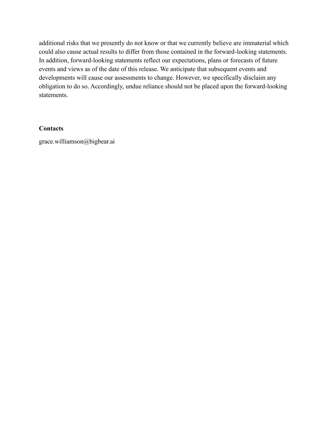 additional risks that we presently do not know or that we currently believe are immaterial which could also cause actual results to differ from those contained in the forward-looking statements. In addition, forward-looking statements reflect our expectations, plans or forecasts of future events and views as of the date of this release. We anticipate that subsequent events and developments will cause our assessments to change. However, we specifically disclaim any obligation to do so. Accordingly, undue reliance should not be placed upon the forward-looking statements. Contacts grace.williamson@bigbear.ai