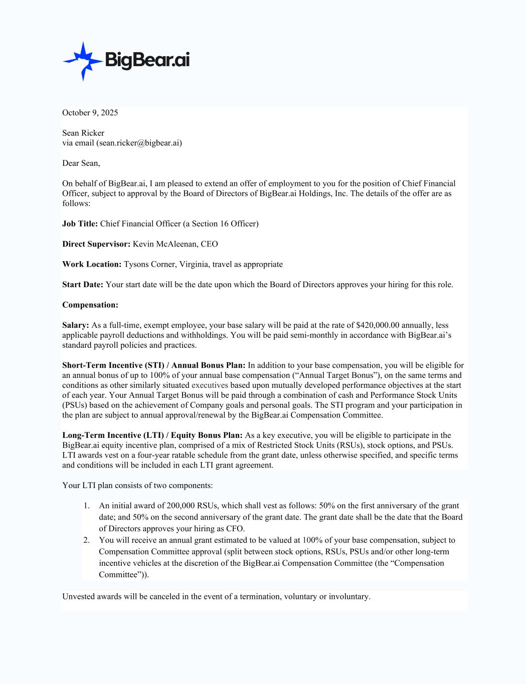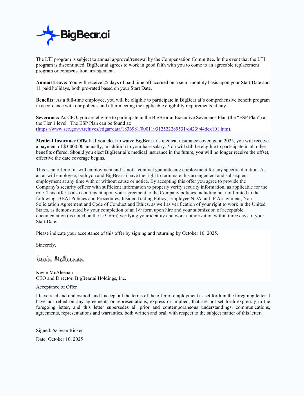 The LTI program is subject to annual approval/renewal by the Compensation Committee. In the event that the LTI program is discontinued, BigBear.ai agrees to work in good faith with you to come to an agreeable replacement program or compensation arrangement. Annual Leave: You will receive 25 days of paid time off accrued on a semi-monthly basis upon your Start Date and 11 paid holidays, both pro-rated based on your Start Date. Benefits: As a full-time employee, you will be eligible to participate in BigBear.ai’s comprehensive benefit program in accordance with our policies and after meeting the applicable eligibility requirements, if any. Severance: As CFO, you are eligible to participate in the BigBear.ai Executive Severance Plan (the “ESP Plan”) at the Tier 1 level. The ESP Plan can be found at: (https://www.sec.gov/Archives/edgar/data/1836981/000119312522289531/d423944dex101.htm). Medical Insurance Offset: If you elect to waive BigBear.ai’s medical insurance coverage in 2025, you will receive a payment of $3,000.00 annually, in addition to your base salary. You will still be eligible to participate in all other benefits offered. Should you elect BigBear.ai’s medical insurance in the future, you will no longer receive the offset, effective the date coverage begins. This is an offer of at-will employment and is not a contract guaranteeing employment for any specific duration. As an at-will employee, both you and BigBear.ai have the right to terminate this arrangement and subsequent employment at any time with or without cause or notice. By accepting this offer you agree to provide the Company’s security officer with sufficient information to properly verify security information, as applicable for the role. This offer is also contingent upon your agreement to the Company policies including but not limited to the following: BBAI Policies and Procedures, Insider Trading Policy, Employee NDA and IP Assignment, Non- Solicitation Agreement and Code of Conduct and Ethics, as well as verification of your right to work in the United States, as demonstrated by your completion of an I-9 form upon hire and your submission of acceptable documentation (as noted on the I-9 form) verifying your identity and work authorization within three days of your Start Date. Please indicate your acceptance of this offer by signing and returning by October 10, 2025. Sincerely, Kevin McAleenan CEO and Director, BigBear.ai Holdings, Inc. Acceptance of Offer I have read and understood, and I accept all the terms of the offer of employment as set forth in the foregoing letter. I have not relied on any agreements or representations, express or implied, that are not set forth expressly in the foregoing letter, and this letter supersedes all prior and contemporaneous understandings, communications, agreements, representations and warranties, both written and oral, with respect to the subject matter of this letter. Signed: /s/ Sean Ricker Date: October 10, 2025
