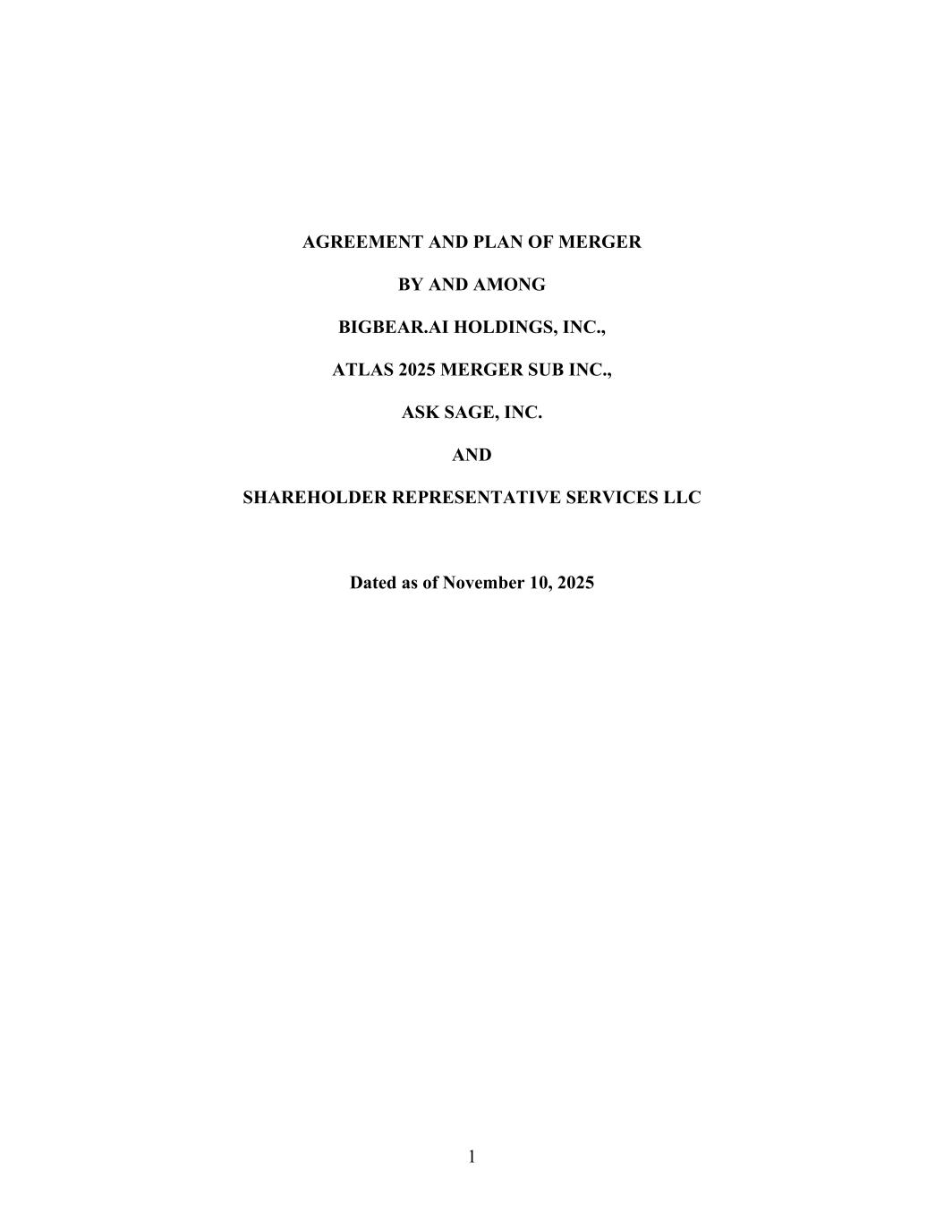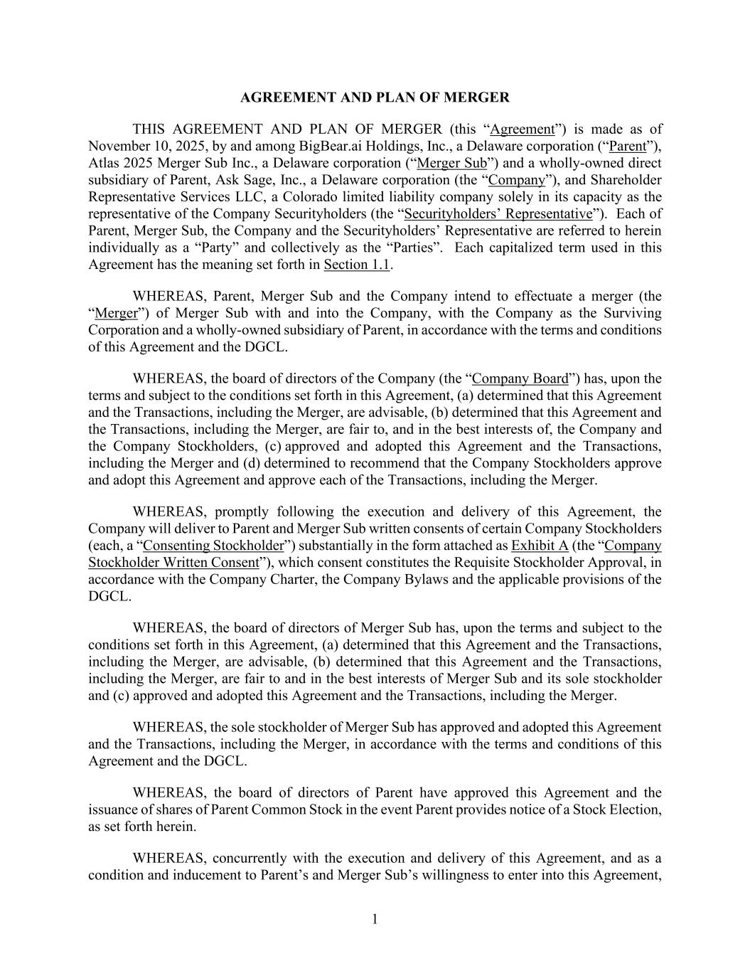 1 AGREEMENT AND PLAN OF MERGER THIS AGREEMENT AND PLAN OF MERGER (this “Agreement”) is made as of November 10, 2025, by and among BigBear.ai Holdings, Inc., a Delaware corporation (“Parent”), Atlas 2025 Merger Sub Inc., a Delaware corporation (“Merger Sub”) and a wholly-owned direct subsidiary of Parent, Ask Sage, Inc., a Delaware corporation (the “Company”), and Shareholder Representative Services LLC, a Colorado limited liability company solely in its capacity as the representative of the Company Securityholders (the “Securityholders’ Representative”). Each of Parent, Merger Sub, the Company and the Securityholders’ Representative are referred to herein individually as a “Party” and collectively as the “Parties”. Each capitalized term used in this Agreement has the meaning set forth in Section 1.1. WHEREAS, Parent, Merger Sub and the Company intend to effectuate a merger (the “Merger”) of Merger Sub with and into the Company, with the Company as the Surviving Corporation and a wholly-owned subsidiary of Parent, in accordance with the terms and conditions of this Agreement and the DGCL. WHEREAS, the board of directors of the Company (the “Company Board”) has, upon the terms and subject to the conditions set forth in this Agreement, (a) determined that this Agreement and the Transactions, including the Merger, are advisable, (b) determined that this Agreement and the Transactions, including the Merger, are fair to, and in the best interests of, the Company and the Company Stockholders, (c) approved and adopted this Agreement and the Transactions, including the Merger and (d) determined to recommend that the Company Stockholders approve and adopt this Agreement and approve each of the Transactions, including the Merger. WHEREAS, promptly following the execution and delivery of this Agreement, the Company will deliver to Parent and Merger Sub written consents of certain Company Stockholders (each, a “Consenting Stockholder”) substantially in the form attached as Exhibit A (the “Company Stockholder Written Consent”), which consent constitutes the Requisite Stockholder Approval, in accordance with the Company Charter, the Company Bylaws and the applicable provisions of the DGCL. WHEREAS, the board of directors of Merger Sub has, upon the terms and subject to the conditions set forth in this Agreement, (a) determined that this Agreement and the Transactions, including the Merger, are advisable, (b) determined that this Agreement and the Transactions, including the Merger, are fair to and in the best interests of Merger Sub and its sole stockholder and (c) approved and adopted this Agreement and the Transactions, including the Merger. WHEREAS, the sole stockholder of Merger Sub has approved and adopted this Agreement and the Transactions, including the Merger, in accordance with the terms and conditions of this Agreement and the DGCL. WHEREAS, the board of directors of Parent have approved this Agreement and the issuance of shares of Parent Common Stock in the event Parent provides notice of a Stock Election, as set forth herein. WHEREAS, concurrently with the execution and delivery of this Agreement, and as a condition and inducement to Parent’s and Merger Sub’s willingness to enter into this Agreement,