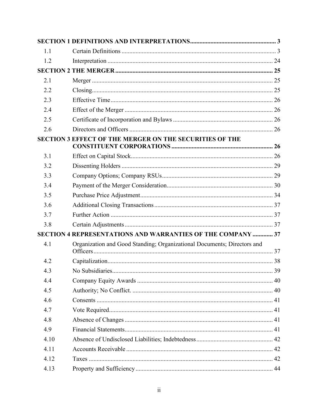 ii SECTION 1 DEFINITIONS AND INTERPRETATIONS ....................................................... 3 1.1 Certain Definitions ................................................................................................... 3 1.2 Interpretation .......................................................................................................... 24 SECTION 2 THE MERGER ..................................................................................................... 25 2.1 Merger .................................................................................................................... 25 2.2 Closing .................................................................................................................... 25 2.3 Effective Time ........................................................................................................ 26 2.4 Effect of the Merger ............................................................................................... 26 2.5 Certificate of Incorporation and Bylaws ................................................................ 26 2.6 Directors and Officers ............................................................................................ 26 SECTION 3 EFFECT OF THE MERGER ON THE SECURITIES OF THE CONSTITUENT CORPORATIONS ................................................................. 26 3.1 Effect on Capital Stock ........................................................................................... 26 3.2 Dissenting Holders ................................................................................................. 29 3.3 Company Options; Company RSUs ....................................................................... 29 3.4 Payment of the Merger Consideration .................................................................... 30 3.5 Purchase Price Adjustment ..................................................................................... 34 3.6 Additional Closing Transactions ............................................................................ 37 3.7 Further Action ........................................................................................................ 37 3.8 Certain Adjustments ............................................................................................... 37 SECTION 4 REPRESENTATIONS AND WARRANTIES OF THE COMPANY ............. 37 4.1 Organization and Good Standing; Organizational Documents; Directors and Officers ................................................................................................................... 37 4.2 Capitalization .......................................................................................................... 38 4.3 No Subsidiaries ....................................................................................................... 39 4.4 Company Equity Awards ....................................................................................... 40 4.5 Authority; No Conflict. .......................................................................................... 40 4.6 Consents ................................................................................................................. 41 4.7 Vote Required ......................................................................................................... 41 4.8 Absence of Changes ............................................................................................... 41 4.9 Financial Statements ............................................................................................... 41 4.10 Absence of Undisclosed Liabilities; Indebtedness ................................................. 42 4.11 Accounts Receivable .............................................................................................. 42 4.12 Taxes ...................................................................................................................... 42 4.13 Property and Sufficiency ........................................................................................ 44