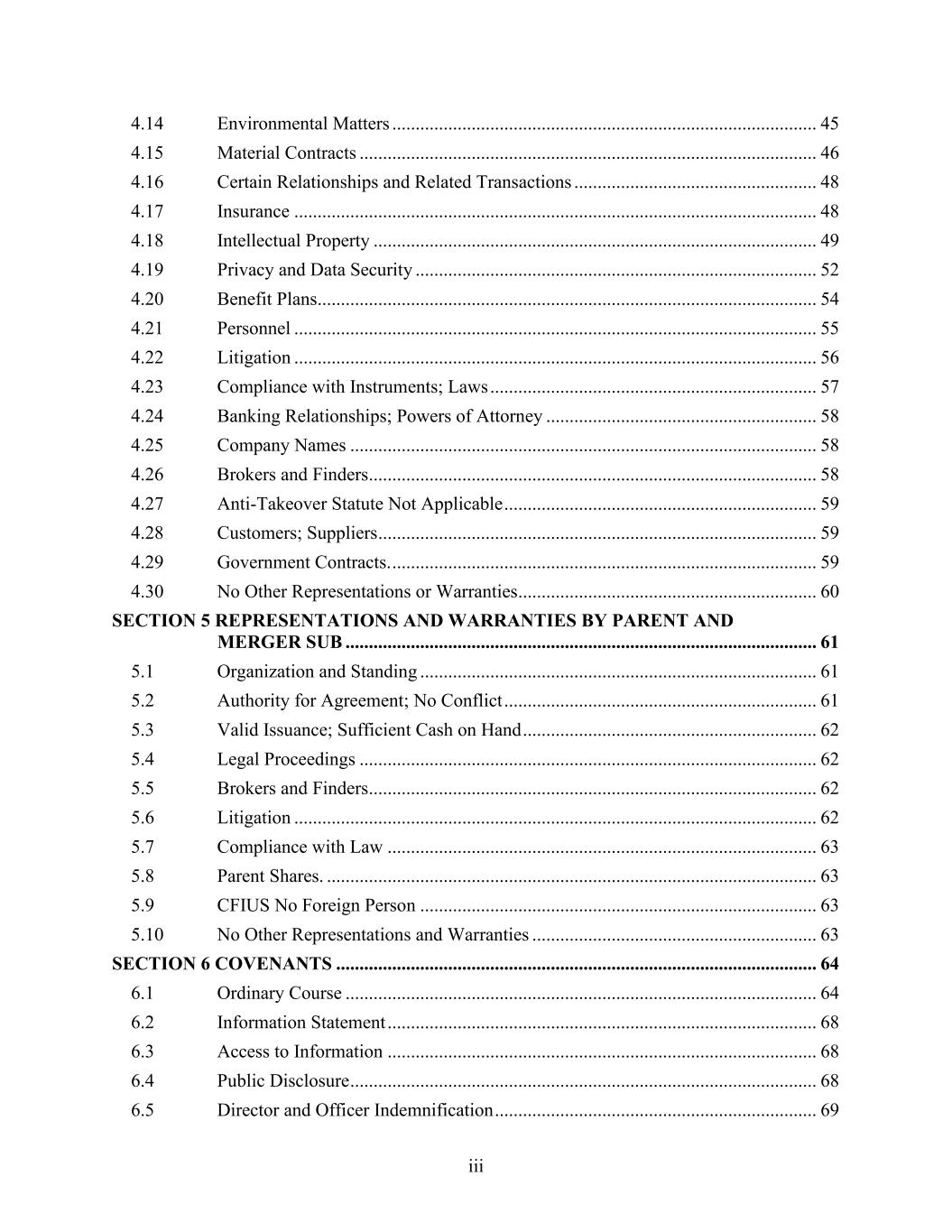 iii 4.14 Environmental Matters ........................................................................................... 45 4.15 Material Contracts .................................................................................................. 46 4.16 Certain Relationships and Related Transactions .................................................... 48 4.17 Insurance ................................................................................................................ 48 4.18 Intellectual Property ............................................................................................... 49 4.19 Privacy and Data Security ...................................................................................... 52 4.20 Benefit Plans ........................................................................................................... 54 4.21 Personnel ................................................................................................................ 55 4.22 Litigation ................................................................................................................ 56 4.23 Compliance with Instruments; Laws ...................................................................... 57 4.24 Banking Relationships; Powers of Attorney .......................................................... 58 4.25 Company Names .................................................................................................... 58 4.26 Brokers and Finders ................................................................................................ 58 4.27 Anti-Takeover Statute Not Applicable ................................................................... 59 4.28 Customers; Suppliers .............................................................................................. 59 4.29 Government Contracts. ........................................................................................... 59 4.30 No Other Representations or Warranties ................................................................ 60 SECTION 5 REPRESENTATIONS AND WARRANTIES BY PARENT AND MERGER SUB ..................................................................................................... 61 5.1 Organization and Standing ..................................................................................... 61 5.2 Authority for Agreement; No Conflict ................................................................... 61 5.3 Valid Issuance; Sufficient Cash on Hand ............................................................... 62 5.4 Legal Proceedings .................................................................................................. 62 5.5 Brokers and Finders ................................................................................................ 62 5.6 Litigation ................................................................................................................ 62 5.7 Compliance with Law ............................................................................................ 63 5.8 Parent Shares. ......................................................................................................... 63 5.9 CFIUS No Foreign Person ..................................................................................... 63 5.10 No Other Representations and Warranties ............................................................. 63 SECTION 6 COVENANTS ....................................................................................................... 64 6.1 Ordinary Course ..................................................................................................... 64 6.2 Information Statement ............................................................................................ 68 6.3 Access to Information ............................................................................................ 68 6.4 Public Disclosure .................................................................................................... 68 6.5 Director and Officer Indemnification ..................................................................... 69