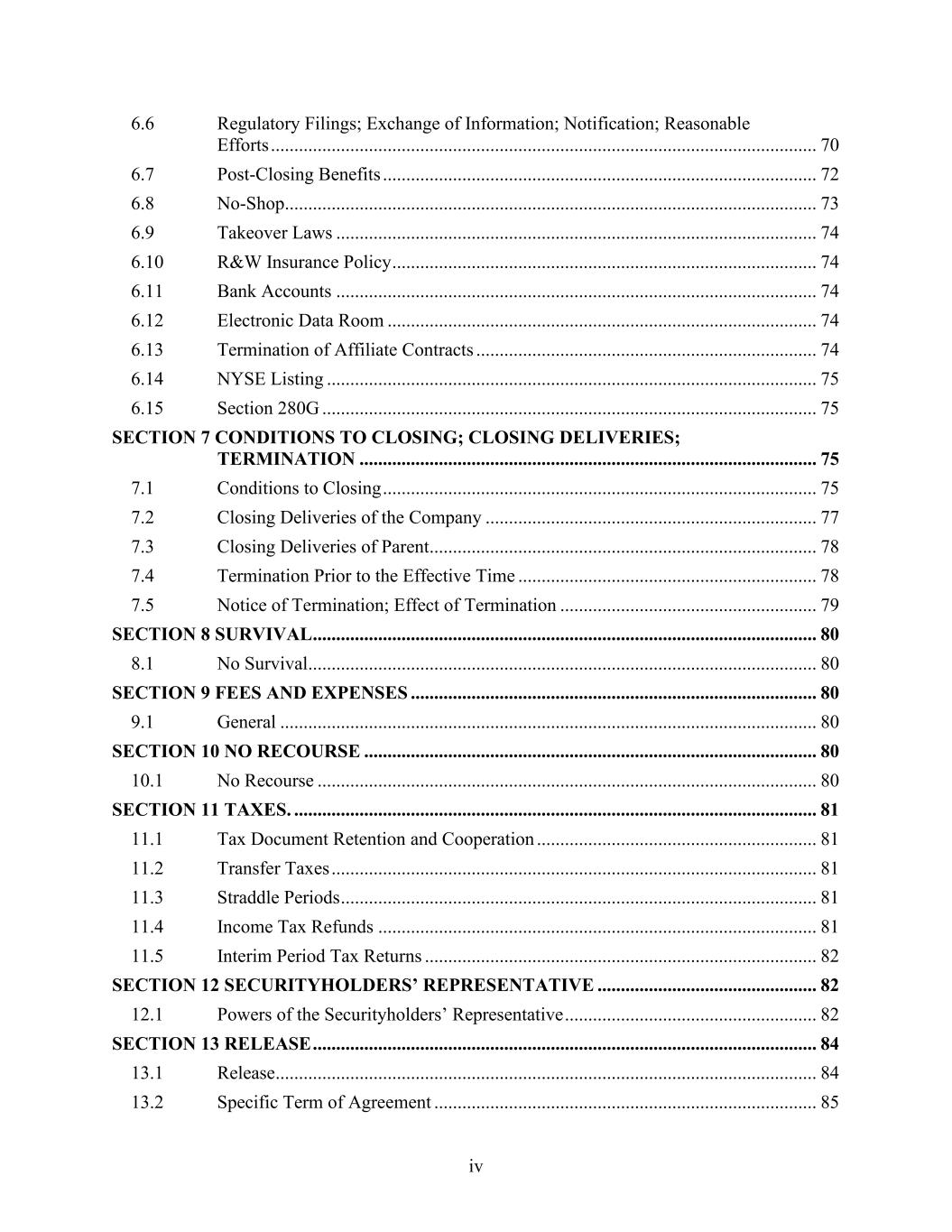 iv 6.6 Regulatory Filings; Exchange of Information; Notification; Reasonable Efforts ..................................................................................................................... 70 6.7 Post-Closing Benefits ............................................................................................. 72 6.8 No-Shop .................................................................................................................. 73 6.9 Takeover Laws ....................................................................................................... 74 6.10 R&W Insurance Policy ........................................................................................... 74 6.11 Bank Accounts ....................................................................................................... 74 6.12 Electronic Data Room ............................................................................................ 74 6.13 Termination of Affiliate Contracts ......................................................................... 74 6.14 NYSE Listing ......................................................................................................... 75 6.15 Section 280G .......................................................................................................... 75 SECTION 7 CONDITIONS TO CLOSING; CLOSING DELIVERIES; TERMINATION .................................................................................................. 75 7.1 Conditions to Closing ............................................................................................. 75 7.2 Closing Deliveries of the Company ....................................................................... 77 7.3 Closing Deliveries of Parent ................................................................................... 78 7.4 Termination Prior to the Effective Time ................................................................ 78 7.5 Notice of Termination; Effect of Termination ....................................................... 79 SECTION 8 SURVIVAL ............................................................................................................ 80 8.1 No Survival ............................................................................................................. 80 SECTION 9 FEES AND EXPENSES ....................................................................................... 80 9.1 General ................................................................................................................... 80 SECTION 10 NO RECOURSE ................................................................................................. 80 10.1 No Recourse ........................................................................................................... 80 SECTION 11 TAXES. ................................................................................................................ 81 11.1 Tax Document Retention and Cooperation ............................................................ 81 11.2 Transfer Taxes ........................................................................................................ 81 11.3 Straddle Periods ...................................................................................................... 81 11.4 Income Tax Refunds .............................................................................................. 81 11.5 Interim Period Tax Returns .................................................................................... 82 SECTION 12 SECURITYHOLDERS’ REPRESENTATIVE ............................................... 82 12.1 Powers of the Securityholders’ Representative ...................................................... 82 SECTION 13 RELEASE ............................................................................................................ 84 13.1 Release .................................................................................................................... 84 13.2 Specific Term of Agreement .................................................................................. 85