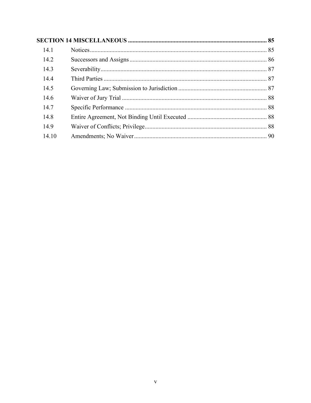 v SECTION 14 MISCELLANEOUS ........................................................................................... 85 14.1 Notices .................................................................................................................... 85 14.2 Successors and Assigns .......................................................................................... 86 14.3 Severability ............................................................................................................. 87 14.4 Third Parties ........................................................................................................... 87 14.5 Governing Law; Submission to Jurisdiction .......................................................... 87 14.6 Waiver of Jury Trial ............................................................................................... 88 14.7 Specific Performance ............................................................................................. 88 14.8 Entire Agreement, Not Binding Until Executed .................................................... 88 14.9 Waiver of Conflicts; Privilege ................................................................................ 88 14.10 Amendments; No Waiver ....................................................................................... 90