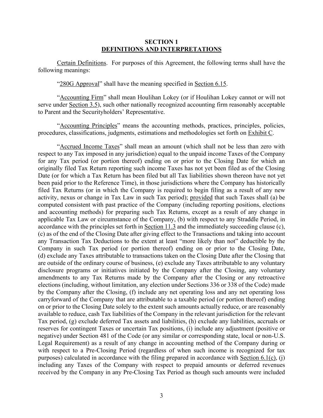 3 SECTION 1 DEFINITIONS AND INTERPRETATIONS Certain Definitions. For purposes of this Agreement, the following terms shall have the following meanings: “280G Approval” shall have the meaning specified in Section 6.15. “Accounting Firm” shall mean Houlihan Lokey (or if Houlihan Lokey cannot or will not serve under Section 3.5), such other nationally recognized accounting firm reasonably acceptable to Parent and the Securityholders’ Representative. “Accounting Principles” means the accounting methods, practices, principles, policies, procedures, classifications, judgments, estimations and methodologies set forth on Exhibit C. “Accrued Income Taxes” shall mean an amount (which shall not be less than zero with respect to any Tax imposed in any jurisdiction) equal to the unpaid income Taxes of the Company for any Tax period (or portion thereof) ending on or prior to the Closing Date for which an originally filed Tax Return reporting such income Taxes has not yet been filed as of the Closing Date (or for which a Tax Return has been filed but all Tax liabilities shown thereon have not yet been paid prior to the Reference Time), in those jurisdictions where the Company has historically filed Tax Returns (or in which the Company is required to begin filing as a result of any new activity, nexus or change in Tax Law in such Tax period); provided that such Taxes shall (a) be computed consistent with past practice of the Company (including reporting positions, elections and accounting methods) for preparing such Tax Returns, except as a result of any change in applicable Tax Law or circumstance of the Company, (b) with respect to any Straddle Period, in accordance with the principles set forth in Section 11.3 and the immediately succeeding clause (c), (c) as of the end of the Closing Date after giving effect to the Transactions and taking into account any Transaction Tax Deductions to the extent at least “more likely than not” deductible by the Company in such Tax period (or portion thereof) ending on or prior to the Closing Date, (d) exclude any Taxes attributable to transactions taken on the Closing Date after the Closing that are outside of the ordinary course of business, (e) exclude any Taxes attributable to any voluntary disclosure programs or initiatives initiated by the Company after the Closing, any voluntary amendments to any Tax Returns made by the Company after the Closing or any retroactive elections (including, without limitation, any election under Sections 336 or 338 of the Code) made by the Company after the Closing, (f) include any net operating loss and any net operating loss carryforward of the Company that are attributable to a taxable period (or portion thereof) ending on or prior to the Closing Date solely to the extent such amounts actually reduce, or are reasonably available to reduce, cash Tax liabilities of the Company in the relevant jurisdiction for the relevant Tax period, (g) exclude deferred Tax assets and liabilities, (h) exclude any liabilities, accruals or reserves for contingent Taxes or uncertain Tax positions, (i) include any adjustment (positive or negative) under Section 481 of the Code (or any similar or corresponding state, local or non-U.S. Legal Requirement) as a result of any change in accounting method of the Company during or with respect to a Pre-Closing Period (regardless of when such income is recognized for tax purposes) calculated in accordance with the filing prepared in accordance with Section 6.1(c), (j) including any Taxes of the Company with respect to prepaid amounts or deferred revenues received by the Company in any Pre-Closing Tax Period as though such amounts were included