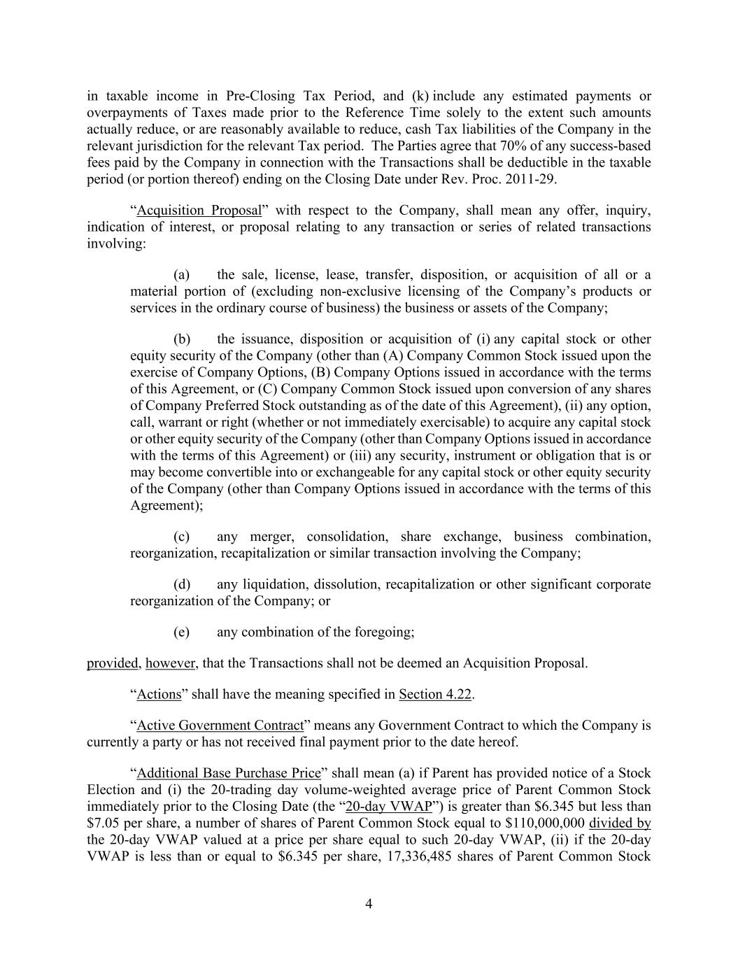 4 in taxable income in Pre-Closing Tax Period, and (k) include any estimated payments or overpayments of Taxes made prior to the Reference Time solely to the extent such amounts actually reduce, or are reasonably available to reduce, cash Tax liabilities of the Company in the relevant jurisdiction for the relevant Tax period. The Parties agree that 70% of any success-based fees paid by the Company in connection with the Transactions shall be deductible in the taxable period (or portion thereof) ending on the Closing Date under Rev. Proc. 2011-29. “Acquisition Proposal” with respect to the Company, shall mean any offer, inquiry, indication of interest, or proposal relating to any transaction or series of related transactions involving: (a) the sale, license, lease, transfer, disposition, or acquisition of all or a material portion of (excluding non-exclusive licensing of the Company’s products or services in the ordinary course of business) the business or assets of the Company; (b) the issuance, disposition or acquisition of (i) any capital stock or other equity security of the Company (other than (A) Company Common Stock issued upon the exercise of Company Options, (B) Company Options issued in accordance with the terms of this Agreement, or (C) Company Common Stock issued upon conversion of any shares of Company Preferred Stock outstanding as of the date of this Agreement), (ii) any option, call, warrant or right (whether or not immediately exercisable) to acquire any capital stock or other equity security of the Company (other than Company Options issued in accordance with the terms of this Agreement) or (iii) any security, instrument or obligation that is or may become convertible into or exchangeable for any capital stock or other equity security of the Company (other than Company Options issued in accordance with the terms of this Agreement); (c) any merger, consolidation, share exchange, business combination, reorganization, recapitalization or similar transaction involving the Company; (d) any liquidation, dissolution, recapitalization or other significant corporate reorganization of the Company; or (e) any combination of the foregoing; provided, however, that the Transactions shall not be deemed an Acquisition Proposal. “Actions” shall have the meaning specified in Section 4.22. “Active Government Contract” means any Government Contract to which the Company is currently a party or has not received final payment prior to the date hereof. “Additional Base Purchase Price” shall mean (a) if Parent has provided notice of a Stock Election and (i) the 20-trading day volume-weighted average price of Parent Common Stock immediately prior to the Closing Date (the “20-day VWAP”) is greater than $6.345 but less than $7.05 per share, a number of shares of Parent Common Stock equal to $110,000,000 divided by the 20-day VWAP valued at a price per share equal to such 20-day VWAP, (ii) if the 20-day VWAP is less than or equal to $6.345 per share, 17,336,485 shares of Parent Common Stock