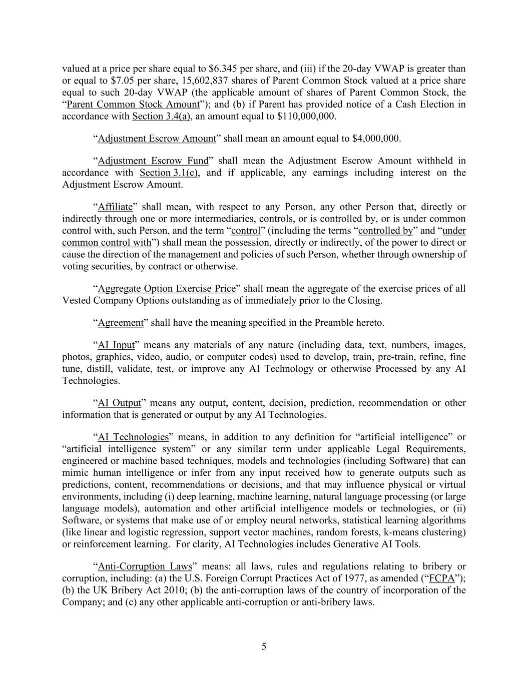 5 valued at a price per share equal to $6.345 per share, and (iii) if the 20-day VWAP is greater than or equal to $7.05 per share, 15,602,837 shares of Parent Common Stock valued at a price share equal to such 20-day VWAP (the applicable amount of shares of Parent Common Stock, the “Parent Common Stock Amount”); and (b) if Parent has provided notice of a Cash Election in accordance with Section 3.4(a), an amount equal to $110,000,000. “Adjustment Escrow Amount” shall mean an amount equal to $4,000,000. “Adjustment Escrow Fund” shall mean the Adjustment Escrow Amount withheld in accordance with Section 3.1(c), and if applicable, any earnings including interest on the Adjustment Escrow Amount. “Affiliate” shall mean, with respect to any Person, any other Person that, directly or indirectly through one or more intermediaries, controls, or is controlled by, or is under common control with, such Person, and the term “control” (including the terms “controlled by” and “under common control with”) shall mean the possession, directly or indirectly, of the power to direct or cause the direction of the management and policies of such Person, whether through ownership of voting securities, by contract or otherwise. “Aggregate Option Exercise Price” shall mean the aggregate of the exercise prices of all Vested Company Options outstanding as of immediately prior to the Closing. “Agreement” shall have the meaning specified in the Preamble hereto. “AI Input” means any materials of any nature (including data, text, numbers, images, photos, graphics, video, audio, or computer codes) used to develop, train, pre-train, refine, fine tune, distill, validate, test, or improve any AI Technology or otherwise Processed by any AI Technologies. “AI Output” means any output, content, decision, prediction, recommendation or other information that is generated or output by any AI Technologies. “AI Technologies” means, in addition to any definition for “artificial intelligence” or “artificial intelligence system” or any similar term under applicable Legal Requirements, engineered or machine based techniques, models and technologies (including Software) that can mimic human intelligence or infer from any input received how to generate outputs such as predictions, content, recommendations or decisions, and that may influence physical or virtual environments, including (i) deep learning, machine learning, natural language processing (or large language models), automation and other artificial intelligence models or technologies, or (ii) Software, or systems that make use of or employ neural networks, statistical learning algorithms (like linear and logistic regression, support vector machines, random forests, k-means clustering) or reinforcement learning. For clarity, AI Technologies includes Generative AI Tools. “Anti-Corruption Laws” means: all laws, rules and regulations relating to bribery or corruption, including: (a) the U.S. Foreign Corrupt Practices Act of 1977, as amended (“FCPA”); (b) the UK Bribery Act 2010; (b) the anti-corruption laws of the country of incorporation of the Company; and (c) any other applicable anti-corruption or anti-bribery laws.