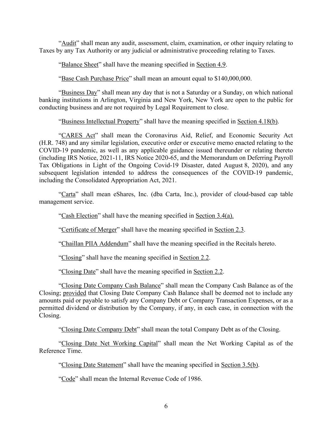 6 “Audit” shall mean any audit, assessment, claim, examination, or other inquiry relating to Taxes by any Tax Authority or any judicial or administrative proceeding relating to Taxes. “Balance Sheet” shall have the meaning specified in Section 4.9. “Base Cash Purchase Price” shall mean an amount equal to $140,000,000. “Business Day” shall mean any day that is not a Saturday or a Sunday, on which national banking institutions in Arlington, Virginia and New York, New York are open to the public for conducting business and are not required by Legal Requirement to close. “Business Intellectual Property” shall have the meaning specified in Section 4.18(b). “CARES Act” shall mean the Coronavirus Aid, Relief, and Economic Security Act (H.R. 748) and any similar legislation, executive order or executive memo enacted relating to the COVID-19 pandemic, as well as any applicable guidance issued thereunder or relating thereto (including IRS Notice, 2021-11, IRS Notice 2020-65, and the Memorandum on Deferring Payroll Tax Obligations in Light of the Ongoing Covid-19 Disaster, dated August 8, 2020), and any subsequent legislation intended to address the consequences of the COVID-19 pandemic, including the Consolidated Appropriation Act, 2021. “Carta” shall mean eShares, Inc. (dba Carta, Inc.), provider of cloud-based cap table management service. “Cash Election” shall have the meaning specified in Section 3.4(a). “Certificate of Merger” shall have the meaning specified in Section 2.3. “Chaillan PIIA Addendum” shall have the meaning specified in the Recitals hereto. “Closing” shall have the meaning specified in Section 2.2. “Closing Date” shall have the meaning specified in Section 2.2. “Closing Date Company Cash Balance” shall mean the Company Cash Balance as of the Closing; provided that Closing Date Company Cash Balance shall be deemed not to include any amounts paid or payable to satisfy any Company Debt or Company Transaction Expenses, or as a permitted dividend or distribution by the Company, if any, in each case, in connection with the Closing. “Closing Date Company Debt” shall mean the total Company Debt as of the Closing. “Closing Date Net Working Capital” shall mean the Net Working Capital as of the Reference Time. “Closing Date Statement” shall have the meaning specified in Section 3.5(b). “Code” shall mean the Internal Revenue Code of 1986.