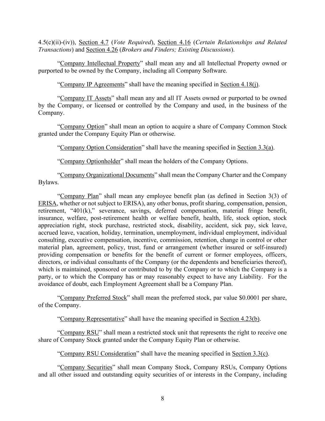 8 4.5(c)(ii)-(iv)), Section 4.7 (Vote Required), Section 4.16 (Certain Relationships and Related Transactions) and Section 4.26 (Brokers and Finders; Existing Discussions). “Company Intellectual Property” shall mean any and all Intellectual Property owned or purported to be owned by the Company, including all Company Software. “Company IP Agreements” shall have the meaning specified in Section 4.18(j). “Company IT Assets” shall mean any and all IT Assets owned or purported to be owned by the Company, or licensed or controlled by the Company and used, in the business of the Company. “Company Option” shall mean an option to acquire a share of Company Common Stock granted under the Company Equity Plan or otherwise. “Company Option Consideration” shall have the meaning specified in Section 3.3(a). “Company Optionholder” shall mean the holders of the Company Options. “Company Organizational Documents” shall mean the Company Charter and the Company Bylaws. “Company Plan” shall mean any employee benefit plan (as defined in Section 3(3) of ERISA, whether or not subject to ERISA), any other bonus, profit sharing, compensation, pension, retirement, “401(k),” severance, savings, deferred compensation, material fringe benefit, insurance, welfare, post-retirement health or welfare benefit, health, life, stock option, stock appreciation right, stock purchase, restricted stock, disability, accident, sick pay, sick leave, accrued leave, vacation, holiday, termination, unemployment, individual employment, individual consulting, executive compensation, incentive, commission, retention, change in control or other material plan, agreement, policy, trust, fund or arrangement (whether insured or self-insured) providing compensation or benefits for the benefit of current or former employees, officers, directors, or individual consultants of the Company (or the dependents and beneficiaries thereof), which is maintained, sponsored or contributed to by the Company or to which the Company is a party, or to which the Company has or may reasonably expect to have any Liability. For the avoidance of doubt, each Employment Agreement shall be a Company Plan. “Company Preferred Stock” shall mean the preferred stock, par value $0.0001 per share, of the Company. “Company Representative” shall have the meaning specified in Section 4.23(b). “Company RSU” shall mean a restricted stock unit that represents the right to receive one share of Company Stock granted under the Company Equity Plan or otherwise. “Company RSU Consideration” shall have the meaning specified in Section 3.3(c). “Company Securities” shall mean Company Stock, Company RSUs, Company Options and all other issued and outstanding equity securities of or interests in the Company, including