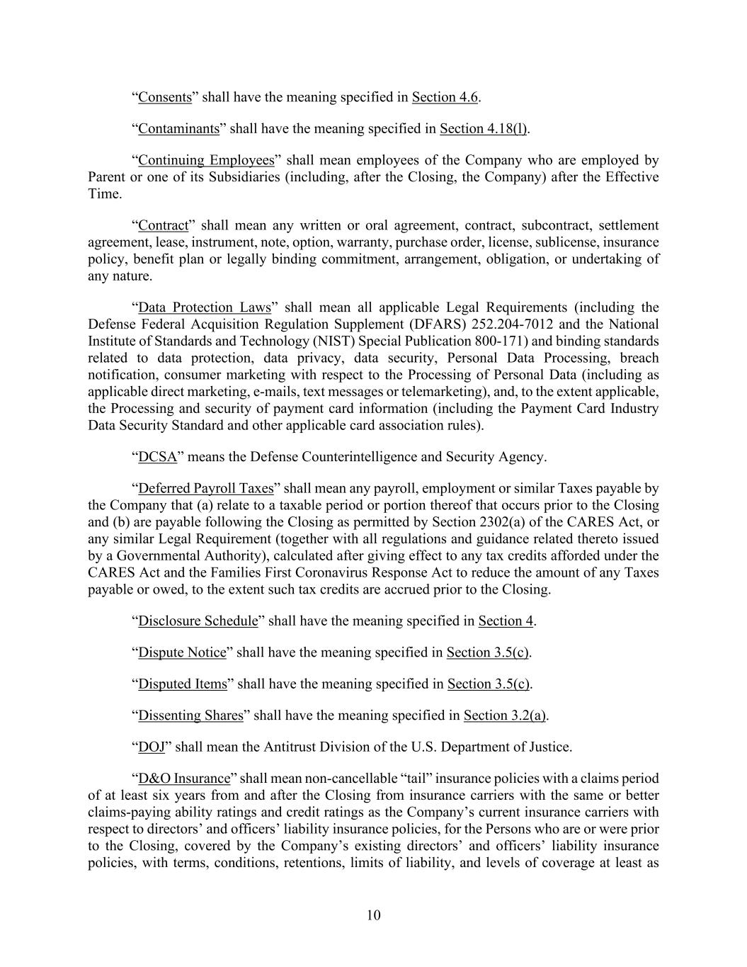 10 “Consents” shall have the meaning specified in Section 4.6. “Contaminants” shall have the meaning specified in Section 4.18(l). “Continuing Employees” shall mean employees of the Company who are employed by Parent or one of its Subsidiaries (including, after the Closing, the Company) after the Effective Time. “Contract” shall mean any written or oral agreement, contract, subcontract, settlement agreement, lease, instrument, note, option, warranty, purchase order, license, sublicense, insurance policy, benefit plan or legally binding commitment, arrangement, obligation, or undertaking of any nature. “Data Protection Laws” shall mean all applicable Legal Requirements (including the Defense Federal Acquisition Regulation Supplement (DFARS) 252.204-7012 and the National Institute of Standards and Technology (NIST) Special Publication 800-171) and binding standards related to data protection, data privacy, data security, Personal Data Processing, breach notification, consumer marketing with respect to the Processing of Personal Data (including as applicable direct marketing, e-mails, text messages or telemarketing), and, to the extent applicable, the Processing and security of payment card information (including the Payment Card Industry Data Security Standard and other applicable card association rules). “DCSA” means the Defense Counterintelligence and Security Agency. “Deferred Payroll Taxes” shall mean any payroll, employment or similar Taxes payable by the Company that (a) relate to a taxable period or portion thereof that occurs prior to the Closing and (b) are payable following the Closing as permitted by Section 2302(a) of the CARES Act, or any similar Legal Requirement (together with all regulations and guidance related thereto issued by a Governmental Authority), calculated after giving effect to any tax credits afforded under the CARES Act and the Families First Coronavirus Response Act to reduce the amount of any Taxes payable or owed, to the extent such tax credits are accrued prior to the Closing. “Disclosure Schedule” shall have the meaning specified in Section 4. “Dispute Notice” shall have the meaning specified in Section 3.5(c). “Disputed Items” shall have the meaning specified in Section 3.5(c). “Dissenting Shares” shall have the meaning specified in Section 3.2(a). “DOJ” shall mean the Antitrust Division of the U.S. Department of Justice. “D&O Insurance” shall mean non-cancellable “tail” insurance policies with a claims period of at least six years from and after the Closing from insurance carriers with the same or better claims-paying ability ratings and credit ratings as the Company’s current insurance carriers with respect to directors’ and officers’ liability insurance policies, for the Persons who are or were prior to the Closing, covered by the Company’s existing directors’ and officers’ liability insurance policies, with terms, conditions, retentions, limits of liability, and levels of coverage at least as