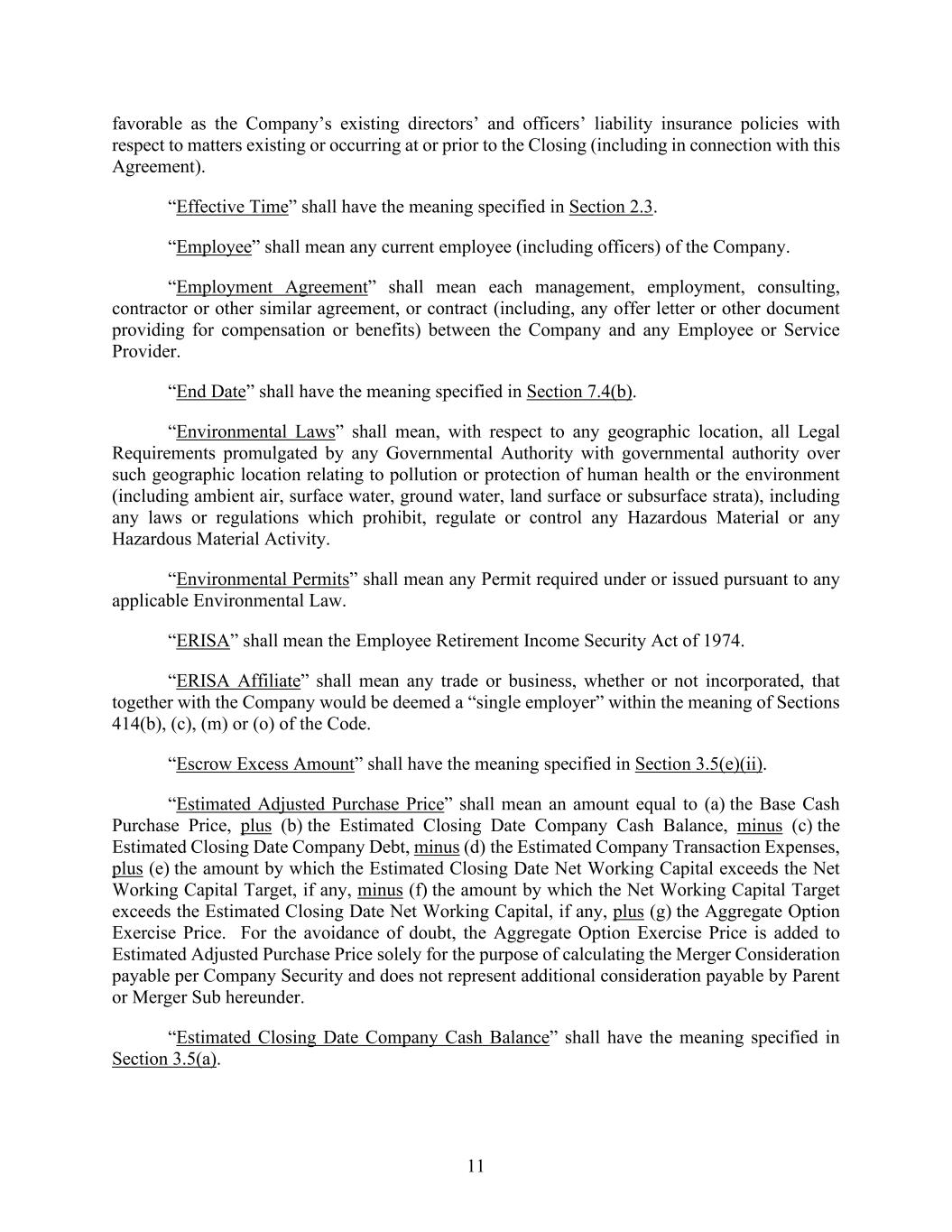 11 favorable as the Company’s existing directors’ and officers’ liability insurance policies with respect to matters existing or occurring at or prior to the Closing (including in connection with this Agreement). “Effective Time” shall have the meaning specified in Section 2.3. “Employee” shall mean any current employee (including officers) of the Company. “Employment Agreement” shall mean each management, employment, consulting, contractor or other similar agreement, or contract (including, any offer letter or other document providing for compensation or benefits) between the Company and any Employee or Service Provider. “End Date” shall have the meaning specified in Section 7.4(b). “Environmental Laws” shall mean, with respect to any geographic location, all Legal Requirements promulgated by any Governmental Authority with governmental authority over such geographic location relating to pollution or protection of human health or the environment (including ambient air, surface water, ground water, land surface or subsurface strata), including any laws or regulations which prohibit, regulate or control any Hazardous Material or any Hazardous Material Activity. “Environmental Permits” shall mean any Permit required under or issued pursuant to any applicable Environmental Law. “ERISA” shall mean the Employee Retirement Income Security Act of 1974. “ERISA Affiliate” shall mean any trade or business, whether or not incorporated, that together with the Company would be deemed a “single employer” within the meaning of Sections 414(b), (c), (m) or (o) of the Code. “Escrow Excess Amount” shall have the meaning specified in Section 3.5(e)(ii). “Estimated Adjusted Purchase Price” shall mean an amount equal to (a) the Base Cash Purchase Price, plus (b) the Estimated Closing Date Company Cash Balance, minus (c) the Estimated Closing Date Company Debt, minus (d) the Estimated Company Transaction Expenses, plus (e) the amount by which the Estimated Closing Date Net Working Capital exceeds the Net Working Capital Target, if any, minus (f) the amount by which the Net Working Capital Target exceeds the Estimated Closing Date Net Working Capital, if any, plus (g) the Aggregate Option Exercise Price. For the avoidance of doubt, the Aggregate Option Exercise Price is added to Estimated Adjusted Purchase Price solely for the purpose of calculating the Merger Consideration payable per Company Security and does not represent additional consideration payable by Parent or Merger Sub hereunder. “Estimated Closing Date Company Cash Balance” shall have the meaning specified in Section 3.5(a).