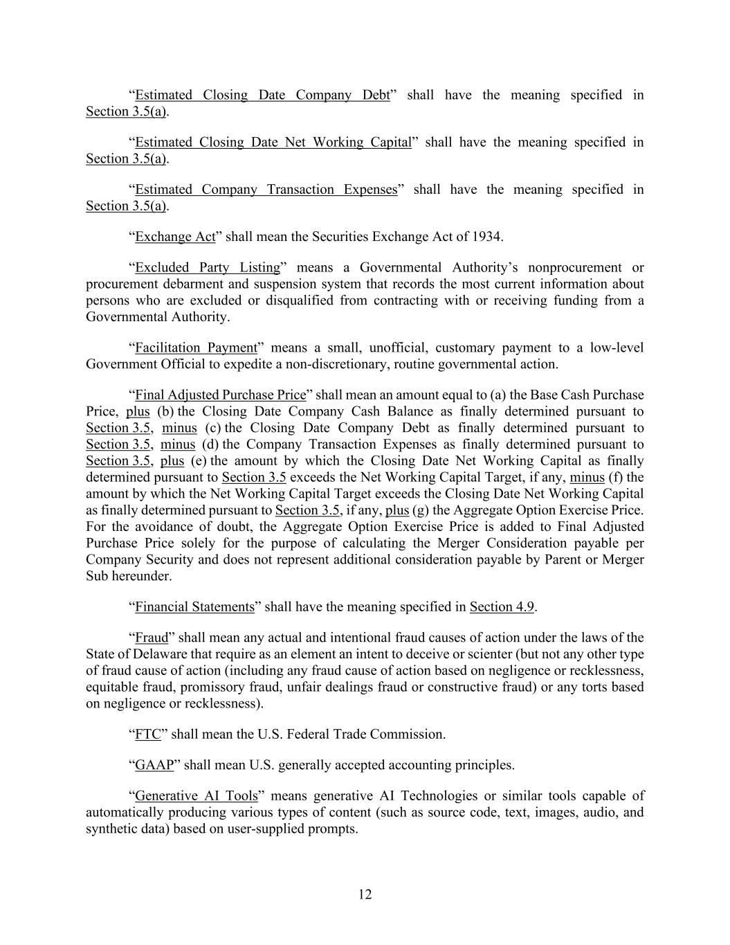 12 “Estimated Closing Date Company Debt” shall have the meaning specified in Section 3.5(a). “Estimated Closing Date Net Working Capital” shall have the meaning specified in Section 3.5(a). “Estimated Company Transaction Expenses” shall have the meaning specified in Section 3.5(a). “Exchange Act” shall mean the Securities Exchange Act of 1934. “Excluded Party Listing” means a Governmental Authority’s nonprocurement or procurement debarment and suspension system that records the most current information about persons who are excluded or disqualified from contracting with or receiving funding from a Governmental Authority. “Facilitation Payment” means a small, unofficial, customary payment to a low-level Government Official to expedite a non-discretionary, routine governmental action. “Final Adjusted Purchase Price” shall mean an amount equal to (a) the Base Cash Purchase Price, plus (b) the Closing Date Company Cash Balance as finally determined pursuant to Section 3.5, minus (c) the Closing Date Company Debt as finally determined pursuant to Section 3.5, minus (d) the Company Transaction Expenses as finally determined pursuant to Section 3.5, plus (e) the amount by which the Closing Date Net Working Capital as finally determined pursuant to Section 3.5 exceeds the Net Working Capital Target, if any, minus (f) the amount by which the Net Working Capital Target exceeds the Closing Date Net Working Capital as finally determined pursuant to Section 3.5, if any, plus (g) the Aggregate Option Exercise Price. For the avoidance of doubt, the Aggregate Option Exercise Price is added to Final Adjusted Purchase Price solely for the purpose of calculating the Merger Consideration payable per Company Security and does not represent additional consideration payable by Parent or Merger Sub hereunder. “Financial Statements” shall have the meaning specified in Section 4.9. “Fraud” shall mean any actual and intentional fraud causes of action under the laws of the State of Delaware that require as an element an intent to deceive or scienter (but not any other type of fraud cause of action (including any fraud cause of action based on negligence or recklessness, equitable fraud, promissory fraud, unfair dealings fraud or constructive fraud) or any torts based on negligence or recklessness). “FTC” shall mean the U.S. Federal Trade Commission. “GAAP” shall mean U.S. generally accepted accounting principles. “Generative AI Tools” means generative AI Technologies or similar tools capable of automatically producing various types of content (such as source code, text, images, audio, and synthetic data) based on user-supplied prompts.