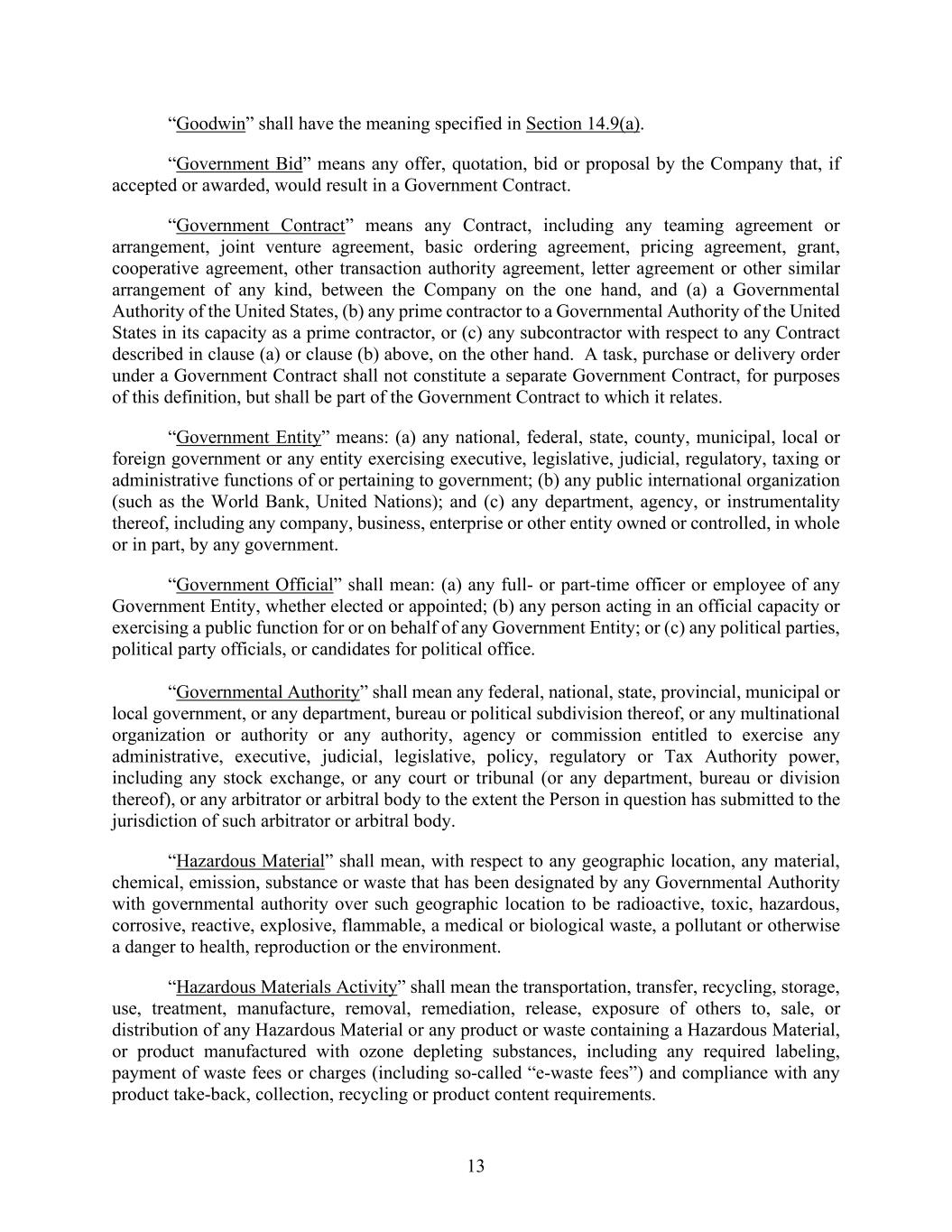 13 “Goodwin” shall have the meaning specified in Section 14.9(a). “Government Bid” means any offer, quotation, bid or proposal by the Company that, if accepted or awarded, would result in a Government Contract. “Government Contract” means any Contract, including any teaming agreement or arrangement, joint venture agreement, basic ordering agreement, pricing agreement, grant, cooperative agreement, other transaction authority agreement, letter agreement or other similar arrangement of any kind, between the Company on the one hand, and (a) a Governmental Authority of the United States, (b) any prime contractor to a Governmental Authority of the United States in its capacity as a prime contractor, or (c) any subcontractor with respect to any Contract described in clause (a) or clause (b) above, on the other hand. A task, purchase or delivery order under a Government Contract shall not constitute a separate Government Contract, for purposes of this definition, but shall be part of the Government Contract to which it relates. “Government Entity” means: (a) any national, federal, state, county, municipal, local or foreign government or any entity exercising executive, legislative, judicial, regulatory, taxing or administrative functions of or pertaining to government; (b) any public international organization (such as the World Bank, United Nations); and (c) any department, agency, or instrumentality thereof, including any company, business, enterprise or other entity owned or controlled, in whole or in part, by any government. “Government Official” shall mean: (a) any full- or part-time officer or employee of any Government Entity, whether elected or appointed; (b) any person acting in an official capacity or exercising a public function for or on behalf of any Government Entity; or (c) any political parties, political party officials, or candidates for political office. “Governmental Authority” shall mean any federal, national, state, provincial, municipal or local government, or any department, bureau or political subdivision thereof, or any multinational organization or authority or any authority, agency or commission entitled to exercise any administrative, executive, judicial, legislative, policy, regulatory or Tax Authority power, including any stock exchange, or any court or tribunal (or any department, bureau or division thereof), or any arbitrator or arbitral body to the extent the Person in question has submitted to the jurisdiction of such arbitrator or arbitral body. “Hazardous Material” shall mean, with respect to any geographic location, any material, chemical, emission, substance or waste that has been designated by any Governmental Authority with governmental authority over such geographic location to be radioactive, toxic, hazardous, corrosive, reactive, explosive, flammable, a medical or biological waste, a pollutant or otherwise a danger to health, reproduction or the environment. “Hazardous Materials Activity” shall mean the transportation, transfer, recycling, storage, use, treatment, manufacture, removal, remediation, release, exposure of others to, sale, or distribution of any Hazardous Material or any product or waste containing a Hazardous Material, or product manufactured with ozone depleting substances, including any required labeling, payment of waste fees or charges (including so-called “e-waste fees”) and compliance with any product take-back, collection, recycling or product content requirements.