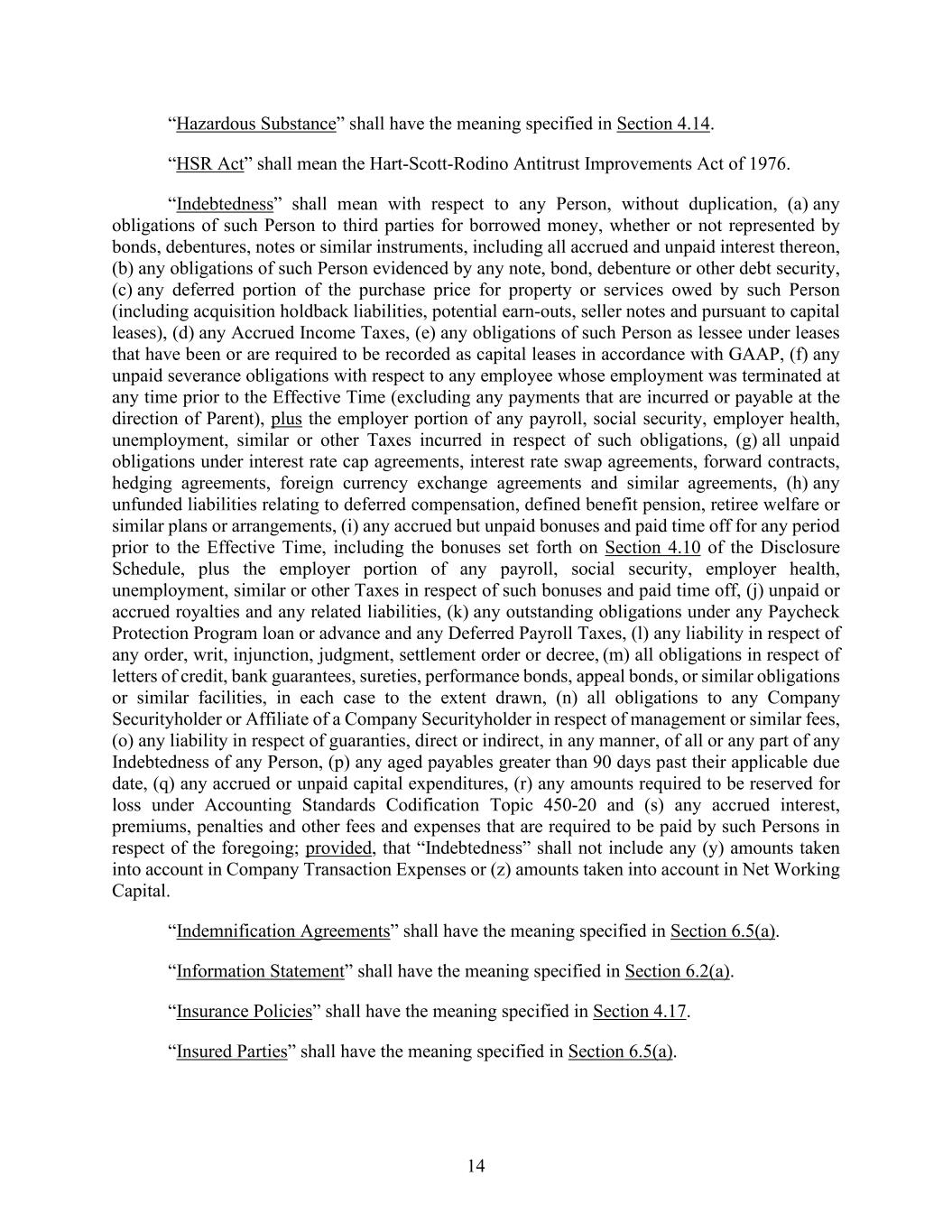 14 “Hazardous Substance” shall have the meaning specified in Section 4.14. “HSR Act” shall mean the Hart-Scott-Rodino Antitrust Improvements Act of 1976. “Indebtedness” shall mean with respect to any Person, without duplication, (a) any obligations of such Person to third parties for borrowed money, whether or not represented by bonds, debentures, notes or similar instruments, including all accrued and unpaid interest thereon, (b) any obligations of such Person evidenced by any note, bond, debenture or other debt security, (c) any deferred portion of the purchase price for property or services owed by such Person (including acquisition holdback liabilities, potential earn-outs, seller notes and pursuant to capital leases), (d) any Accrued Income Taxes, (e) any obligations of such Person as lessee under leases that have been or are required to be recorded as capital leases in accordance with GAAP, (f) any unpaid severance obligations with respect to any employee whose employment was terminated at any time prior to the Effective Time (excluding any payments that are incurred or payable at the direction of Parent), plus the employer portion of any payroll, social security, employer health, unemployment, similar or other Taxes incurred in respect of such obligations, (g) all unpaid obligations under interest rate cap agreements, interest rate swap agreements, forward contracts, hedging agreements, foreign currency exchange agreements and similar agreements, (h) any unfunded liabilities relating to deferred compensation, defined benefit pension, retiree welfare or similar plans or arrangements, (i) any accrued but unpaid bonuses and paid time off for any period prior to the Effective Time, including the bonuses set forth on Section 4.10 of the Disclosure Schedule, plus the employer portion of any payroll, social security, employer health, unemployment, similar or other Taxes in respect of such bonuses and paid time off, (j) unpaid or accrued royalties and any related liabilities, (k) any outstanding obligations under any Paycheck Protection Program loan or advance and any Deferred Payroll Taxes, (l) any liability in respect of any order, writ, injunction, judgment, settlement order or decree, (m) all obligations in respect of letters of credit, bank guarantees, sureties, performance bonds, appeal bonds, or similar obligations or similar facilities, in each case to the extent drawn, (n) all obligations to any Company Securityholder or Affiliate of a Company Securityholder in respect of management or similar fees, (o) any liability in respect of guaranties, direct or indirect, in any manner, of all or any part of any Indebtedness of any Person, (p) any aged payables greater than 90 days past their applicable due date, (q) any accrued or unpaid capital expenditures, (r) any amounts required to be reserved for loss under Accounting Standards Codification Topic 450-20 and (s) any accrued interest, premiums, penalties and other fees and expenses that are required to be paid by such Persons in respect of the foregoing; provided, that “Indebtedness” shall not include any (y) amounts taken into account in Company Transaction Expenses or (z) amounts taken into account in Net Working Capital. “Indemnification Agreements” shall have the meaning specified in Section 6.5(a). “Information Statement” shall have the meaning specified in Section 6.2(a). “Insurance Policies” shall have the meaning specified in Section 4.17. “Insured Parties” shall have the meaning specified in Section 6.5(a).