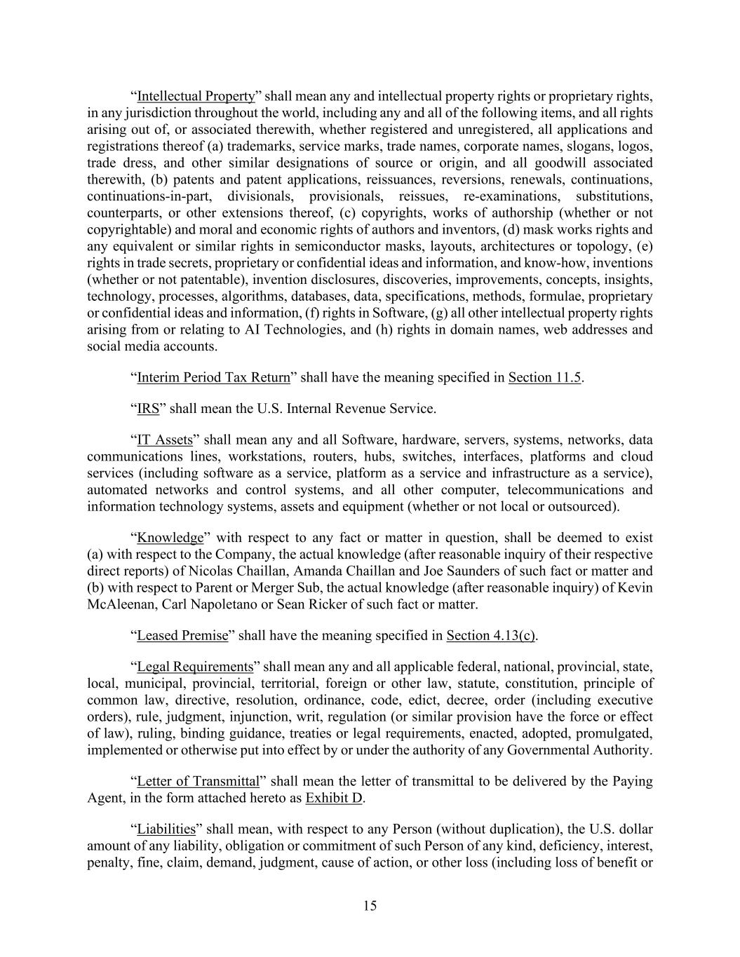 15 “Intellectual Property” shall mean any and intellectual property rights or proprietary rights, in any jurisdiction throughout the world, including any and all of the following items, and all rights arising out of, or associated therewith, whether registered and unregistered, all applications and registrations thereof (a) trademarks, service marks, trade names, corporate names, slogans, logos, trade dress, and other similar designations of source or origin, and all goodwill associated therewith, (b) patents and patent applications, reissuances, reversions, renewals, continuations, continuations-in-part, divisionals, provisionals, reissues, re-examinations, substitutions, counterparts, or other extensions thereof, (c) copyrights, works of authorship (whether or not copyrightable) and moral and economic rights of authors and inventors, (d) mask works rights and any equivalent or similar rights in semiconductor masks, layouts, architectures or topology, (e) rights in trade secrets, proprietary or confidential ideas and information, and know-how, inventions (whether or not patentable), invention disclosures, discoveries, improvements, concepts, insights, technology, processes, algorithms, databases, data, specifications, methods, formulae, proprietary or confidential ideas and information, (f) rights in Software, (g) all other intellectual property rights arising from or relating to AI Technologies, and (h) rights in domain names, web addresses and social media accounts. “Interim Period Tax Return” shall have the meaning specified in Section 11.5. “IRS” shall mean the U.S. Internal Revenue Service. “IT Assets” shall mean any and all Software, hardware, servers, systems, networks, data communications lines, workstations, routers, hubs, switches, interfaces, platforms and cloud services (including software as a service, platform as a service and infrastructure as a service), automated networks and control systems, and all other computer, telecommunications and information technology systems, assets and equipment (whether or not local or outsourced). “Knowledge” with respect to any fact or matter in question, shall be deemed to exist (a) with respect to the Company, the actual knowledge (after reasonable inquiry of their respective direct reports) of Nicolas Chaillan, Amanda Chaillan and Joe Saunders of such fact or matter and (b) with respect to Parent or Merger Sub, the actual knowledge (after reasonable inquiry) of Kevin McAleenan, Carl Napoletano or Sean Ricker of such fact or matter. “Leased Premise” shall have the meaning specified in Section 4.13(c). “Legal Requirements” shall mean any and all applicable federal, national, provincial, state, local, municipal, provincial, territorial, foreign or other law, statute, constitution, principle of common law, directive, resolution, ordinance, code, edict, decree, order (including executive orders), rule, judgment, injunction, writ, regulation (or similar provision have the force or effect of law), ruling, binding guidance, treaties or legal requirements, enacted, adopted, promulgated, implemented or otherwise put into effect by or under the authority of any Governmental Authority. “Letter of Transmittal” shall mean the letter of transmittal to be delivered by the Paying Agent, in the form attached hereto as Exhibit D. “Liabilities” shall mean, with respect to any Person (without duplication), the U.S. dollar amount of any liability, obligation or commitment of such Person of any kind, deficiency, interest, penalty, fine, claim, demand, judgment, cause of action, or other loss (including loss of benefit or