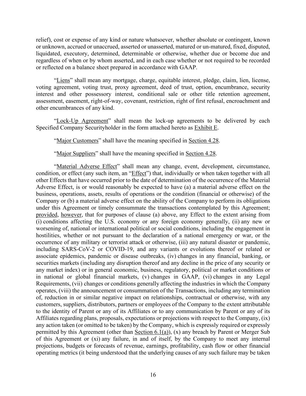 16 relief), cost or expense of any kind or nature whatsoever, whether absolute or contingent, known or unknown, accrued or unaccrued, asserted or unasserted, matured or un-matured, fixed, disputed, liquidated, executory, determined, determinable or otherwise, whether due or become due and regardless of when or by whom asserted, and in each case whether or not required to be recorded or reflected on a balance sheet prepared in accordance with GAAP. “Liens” shall mean any mortgage, charge, equitable interest, pledge, claim, lien, license, voting agreement, voting trust, proxy agreement, deed of trust, option, encumbrance, security interest and other possessory interest, conditional sale or other title retention agreement, assessment, easement, right-of-way, covenant, restriction, right of first refusal, encroachment and other encumbrances of any kind. “Lock-Up Agreement” shall mean the lock-up agreements to be delivered by each Specified Company Securityholder in the form attached hereto as Exhibit E. “Major Customers” shall have the meaning specified in Section 4.28. “Major Suppliers” shall have the meaning specified in Section 4.28. “Material Adverse Effect” shall mean any change, event, development, circumstance, condition, or effect (any such item, an “Effect”) that, individually or when taken together with all other Effects that have occurred prior to the date of determination of the occurrence of the Material Adverse Effect, is or would reasonably be expected to have (a) a material adverse effect on the business, operations, assets, results of operations or the condition (financial or otherwise) of the Company or (b) a material adverse effect on the ability of the Company to perform its obligations under this Agreement or timely consummate the transactions contemplated by this Agreement; provided, however, that for purposes of clause (a) above, any Effect to the extent arising from (i) conditions affecting the U.S. economy or any foreign economy generally, (ii) any new or worsening of, national or international political or social conditions, including the engagement in hostilities, whether or not pursuant to the declaration of a national emergency or war, or the occurrence of any military or terrorist attack or otherwise, (iii) any natural disaster or pandemic, including SARS-CoV-2 or COVID-19, and any variants or evolutions thereof or related or associate epidemics, pandemic or disease outbreaks, (iv) changes in any financial, banking, or securities markets (including any disruption thereof and any decline in the price of any security or any market index) or in general economic, business, regulatory, political or market conditions or in national or global financial markets, (v) changes in GAAP, (vi) changes in any Legal Requirements, (vii) changes or conditions generally affecting the industries in which the Company operates, (viii) the announcement or consummation of the Transactions, including any termination of, reduction in or similar negative impact on relationships, contractual or otherwise, with any customers, suppliers, distributors, partners or employees of the Company to the extent attributable to the identity of Parent or any of its Affiliates or to any communication by Parent or any of its Affiliates regarding plans, proposals, expectations or projections with respect to the Company, (ix) any action taken (or omitted to be taken) by the Company, which is expressly required or expressly permitted by this Agreement (other than Section 6.1(a)), (x) any breach by Parent or Merger Sub of this Agreement or (xi) any failure, in and of itself, by the Company to meet any internal projections, budgets or forecasts of revenue, earnings, profitability, cash flow or other financial operating metrics (it being understood that the underlying causes of any such failure may be taken